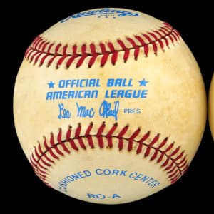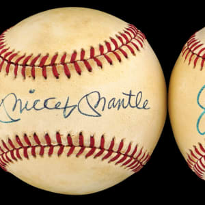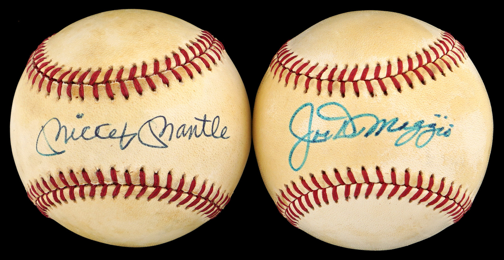 Take a trip to Monument Park with the offered pair of OAL/MacPhail single-signed baseballs authored by New York Yankees Hall of Famers. Despite moderate soiling/toning throughout, the blue autographs are boldly inscribed across the sweet spots. Includes: 1.) DiMaggio and 2.) Mantle. Auction LOA from James Spence/JSA.