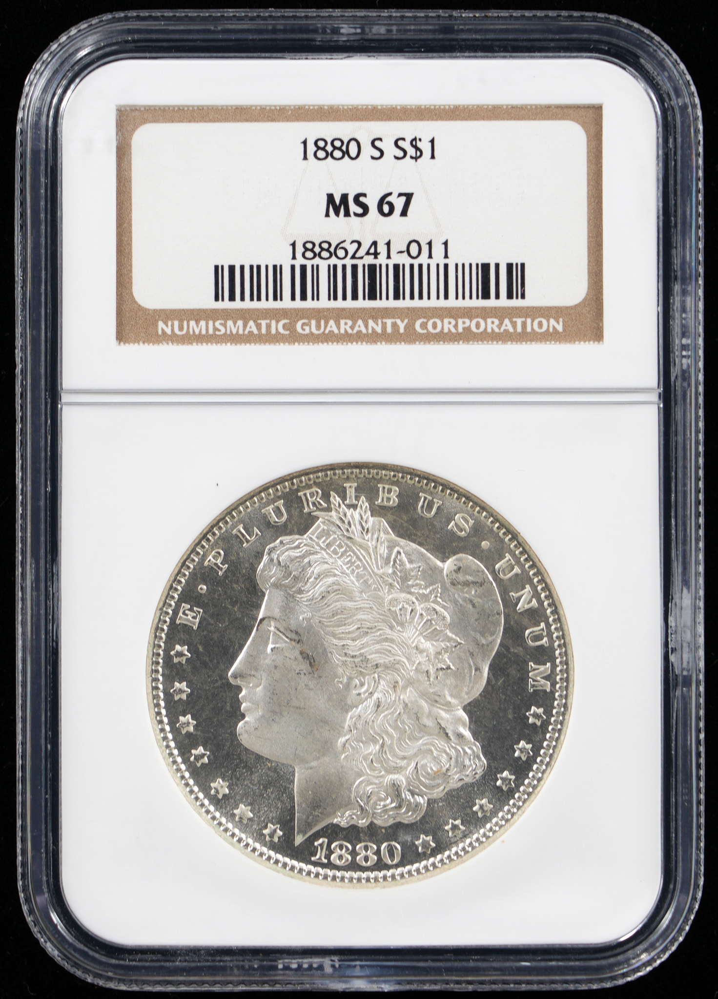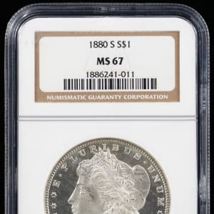 Treat yourself to a numismatic gem, with this 1880-S Morgan silver dollar. Dating from the third year of production for the Morgan dollar type, this 19th Century treasure is a radiant example, with a frosty sheen and magnificent detail definition. Highly regarded certification service NGC has encapsulated this nearly perfect coin with a stellar MS67 grade designation. The surviving population for this date/mintmark is 2,000,000 pieces in all grades, and the estimated survival in grades of MS65 or higher, is 159,000 coins.
