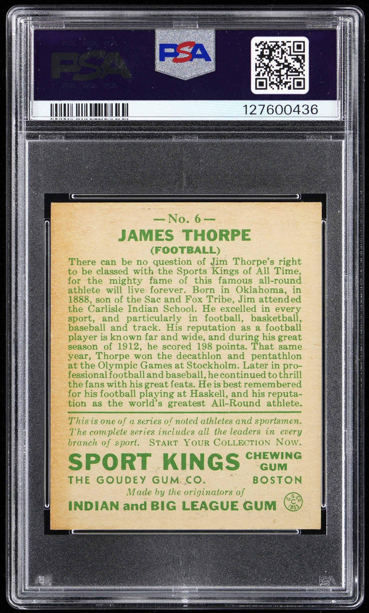 Graded EX-MT 6 by PSA. Named "The Greatest Athlete of the First Half of the Century" by the Associated Press, Jim Thorpe was a trailblazer who excelled in multiple sports. The all-around icon is portrayed as a football player on the offered 1933 Sport Kings Gum #6 gum card. This decently centered portrait of the Native American legend is framed by four sharp corners, clean edges and brilliant player accents set against a radiant yellow backdrop. The green text reverse which details Thorpe's long list of athletic accomplishments is problem-free.