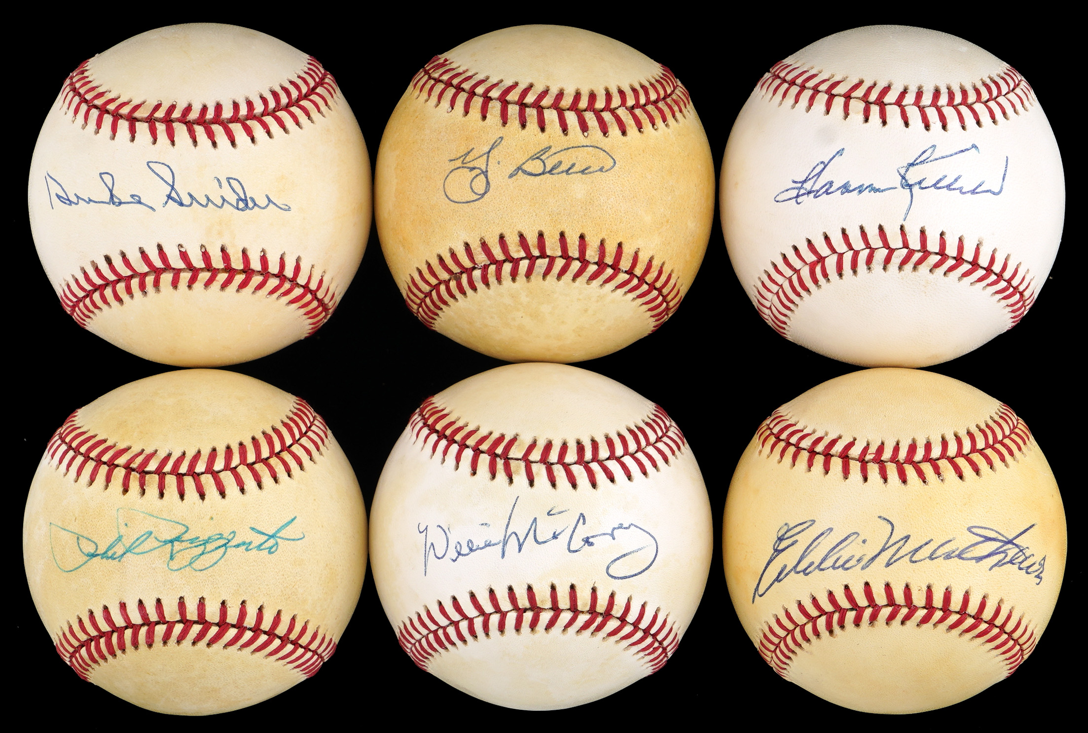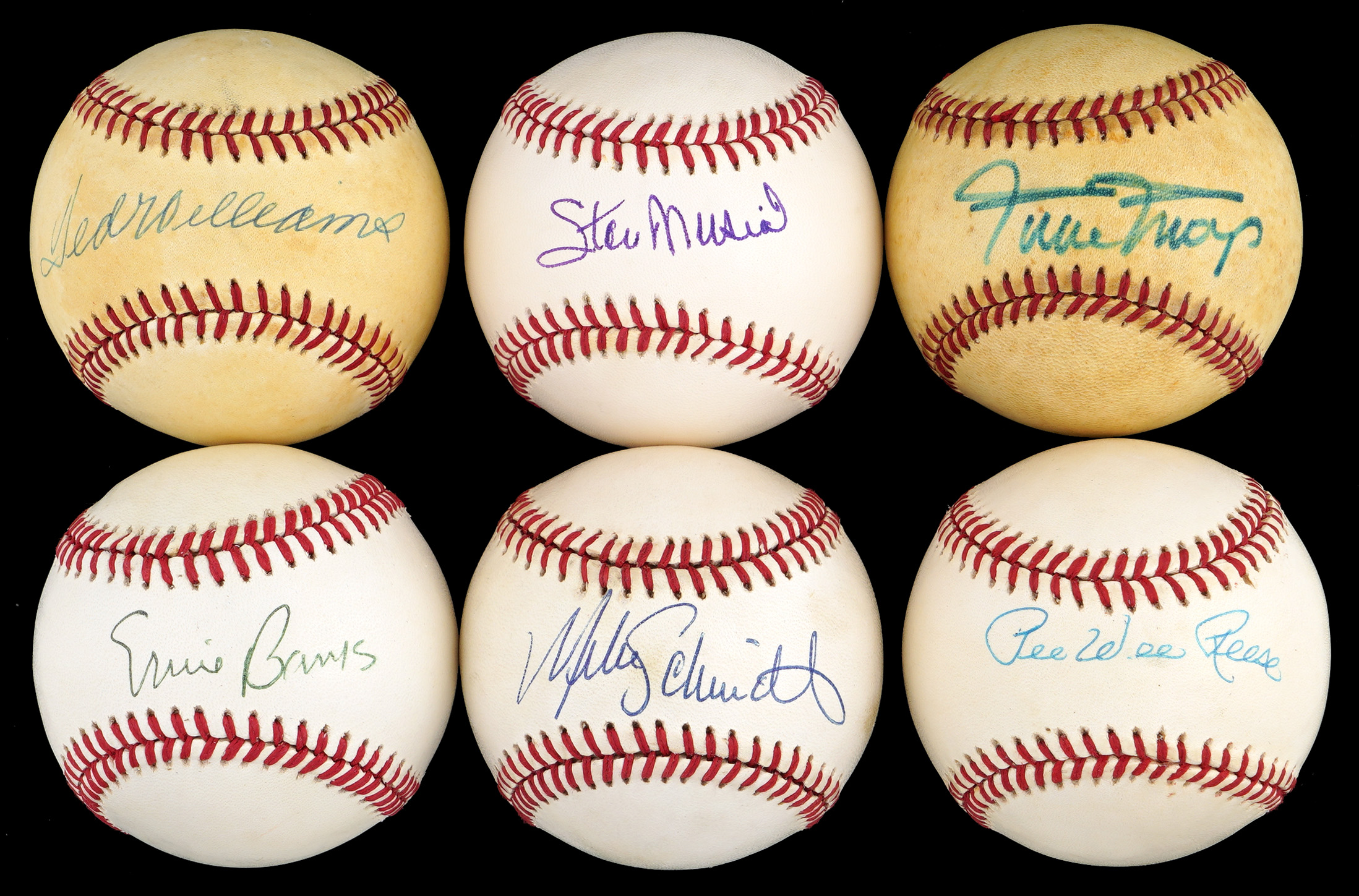 Cooperstown's calling with these (20) Hall of Fame single-signed baseballs. Unless noted, each sphere is penned on the sweet spot with average ("8-9") autographs placed on surfaces with varying degrees of toning. Includes: Appling, Banks, Berra, Doby, Herman, Irvin, Killebrew, Ju. Johnson (east panel), Leonard, Mathews, Mays, McCovey, Musial, Reese, Rizzuto, Schmidt, Schoendienst, Slaughter, Snider and T. Williams. Auction LOA from James Spence/JSA. The size/weight of this item requires that there will be an additional shipping charge for this lot.