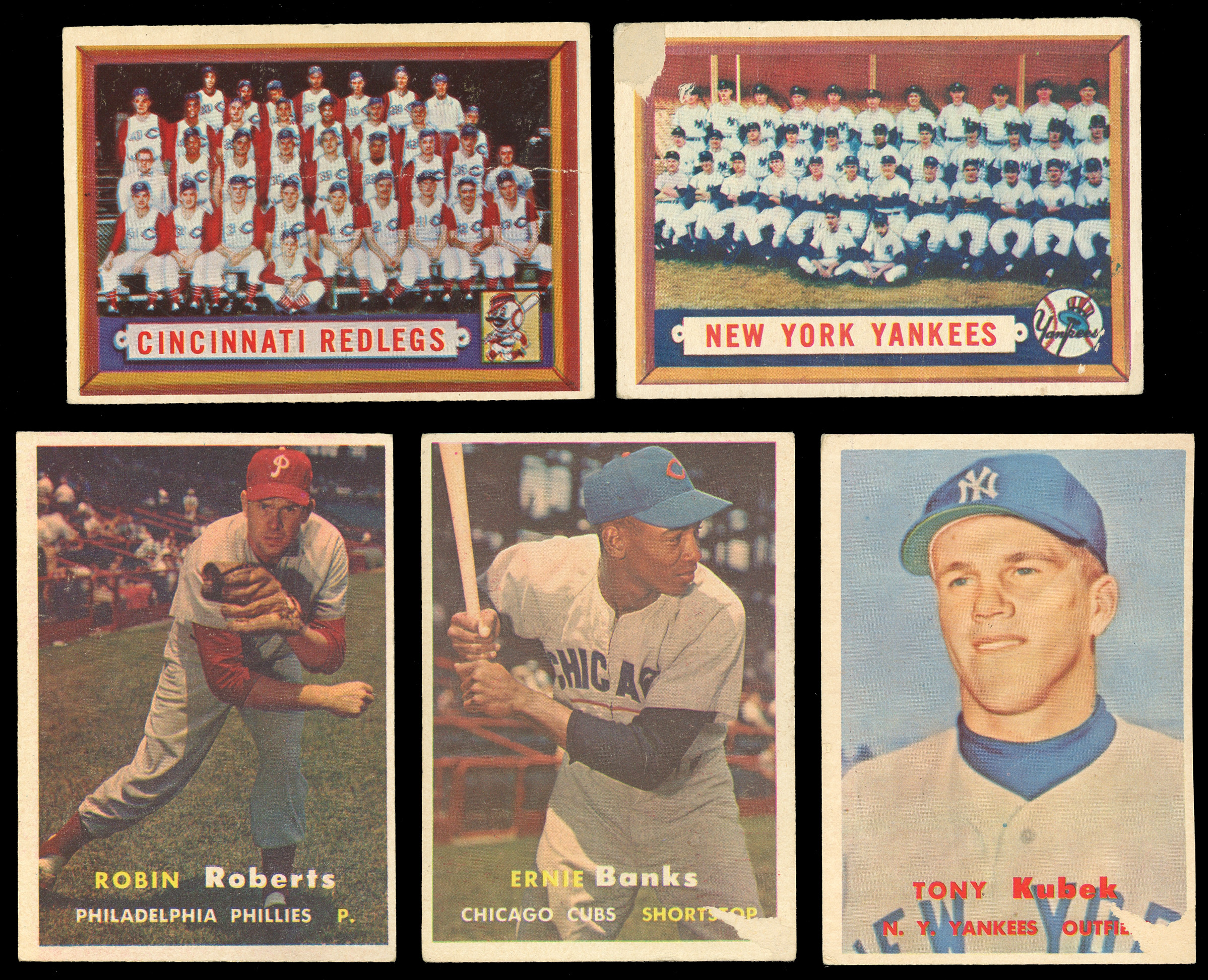 Begin construction on the groundbreaking 1957 Topps edition with the offered starter set of (143/407) cards featuring a multitude of Hall of Famers and stars. This standard-sized assembly generally presents in the (GD to VG) range with 15-20% displaying front paper loss including several New York Yankees. A total of (26) tougher fourth series are present (average GD to VG). Highlights include: #1 T. Williams (VG), #2 Berra (GD), #10 Mays (PR), #15 Roberts (VG-EX), #20 Aaron (GD), #24 Mazeroski RC (GD), #25 Ford (PR, paper loss), #35 F. Robinson RC (VG), #40 Wynn (GD), #55 Banks (PR, paper loss), #70 Ashburn (VG), #76 Clemente (PR, paper loss), #95 Mantle (PR, paper loss), #97 Yankees Team (PR, paper loss), #120 Lemon (VG), #154 Schoendienst (VG-EX), #212 Colavito RC (EX), #215 Slaughter (PR, paper loss), #286 Richardson RC (PR, paper loss), #312 Kubek RC (PR, paper loss), #322 Reds Team (FR) and #338 Bunning RC (GD).