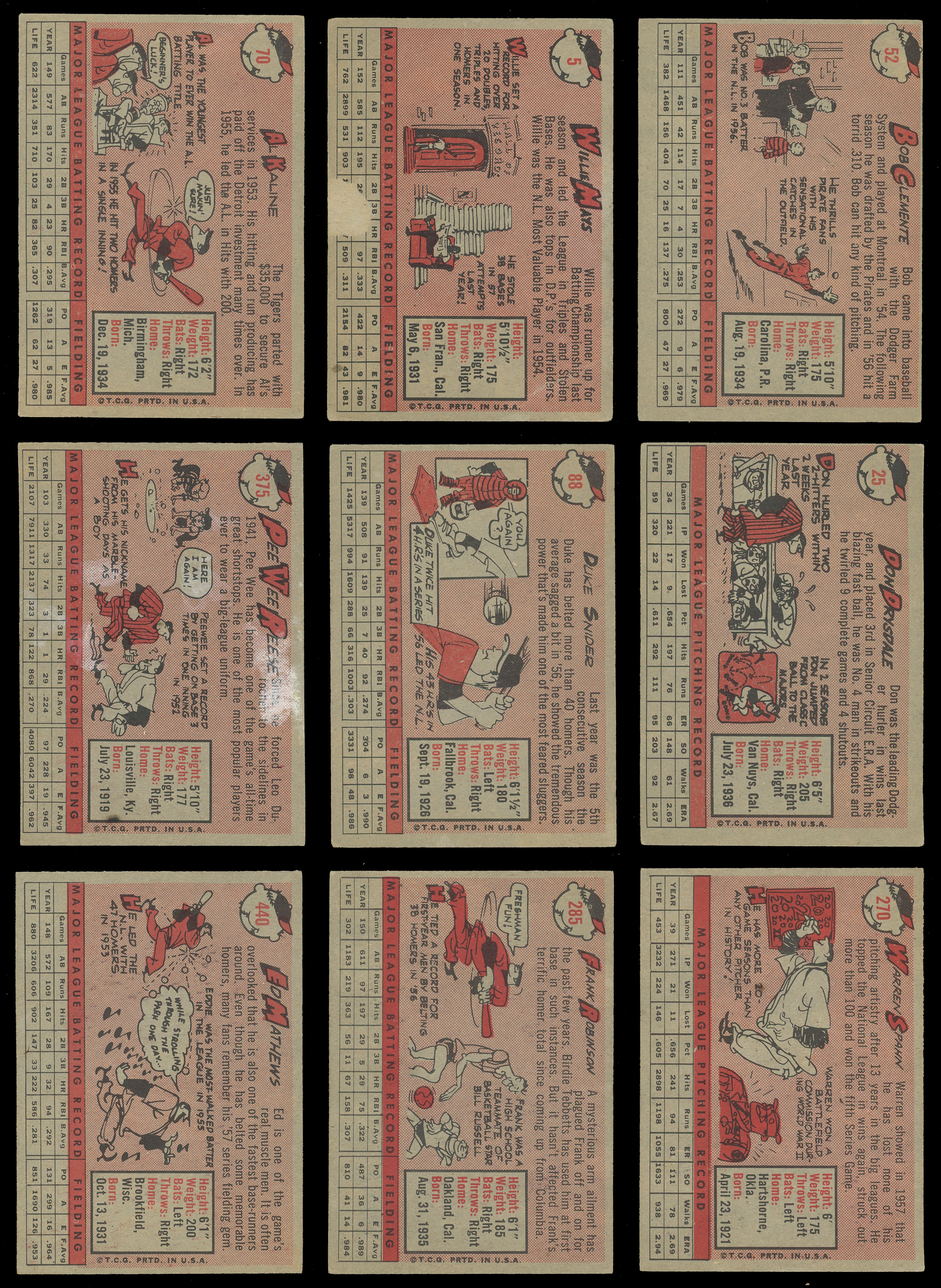 Nifty 1958 Topps starter set of (233/494) cards featuring (20+) Hall of Famers. This “collector’s grade” generally presents in the (VG to VG-EX) range with some better or lesser. Highlights include: #2 Lemon (GD), #5 Mays (PR, reverse paper loss), #25 Drysdale (GD), #52 Clemente (VG), #70 Kaline (VG-EX), #85 Aparicio (VG), #88 Snider (VG), #100 Wynn (PR), #162 Hodges (VG), #230 Ashburn (VG-EX), #246 Yankees Team (GD), #270 Spahn (EX), #271 B. Martin (VG-EX), #285 F. Robinson (VG), #368 Colavito (VG), #375 Reese (VG), #440 Mathews (EX), #464 Flood RC (VG-EX) and #476 Musial AS (GD).