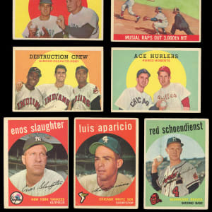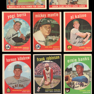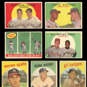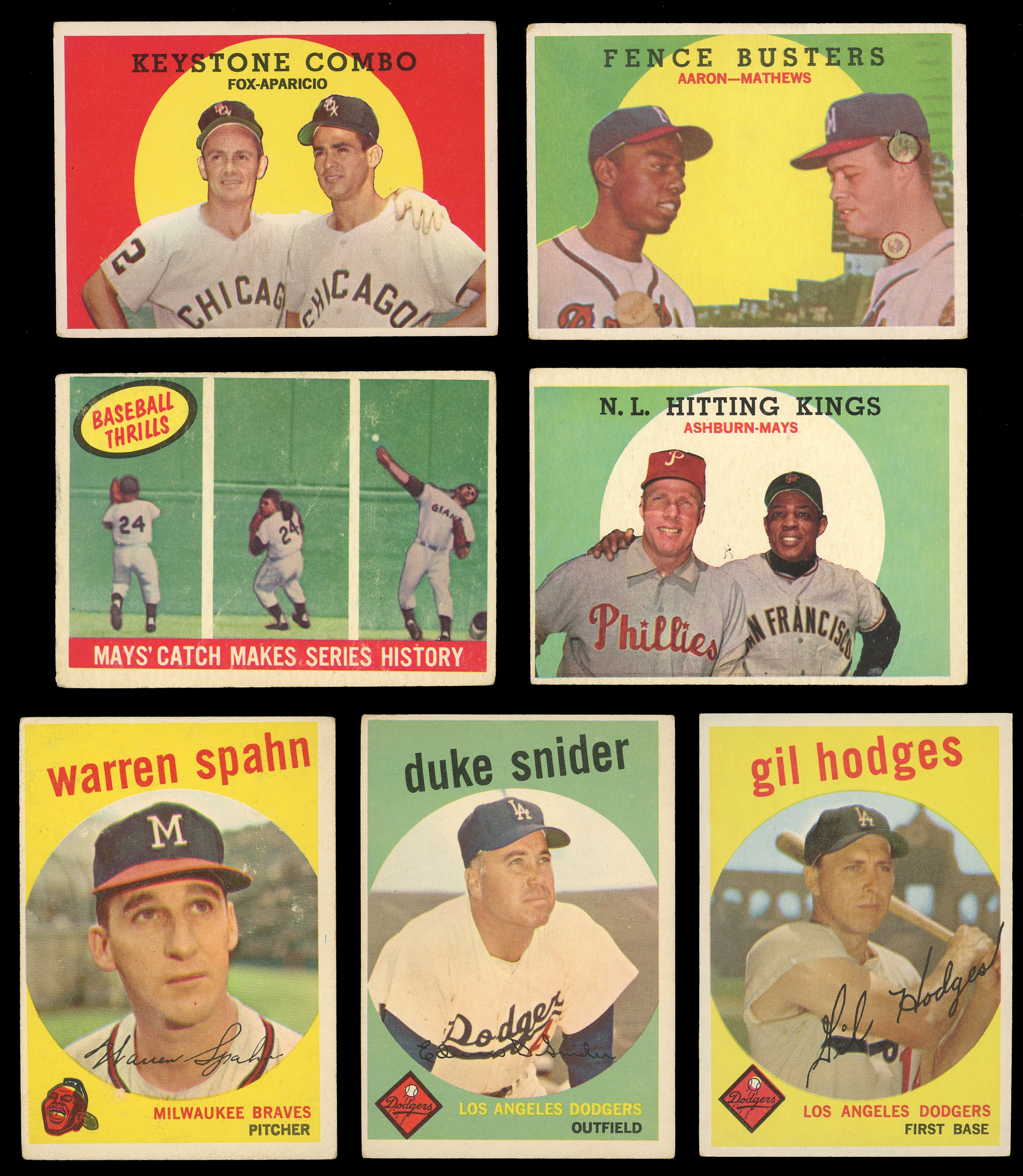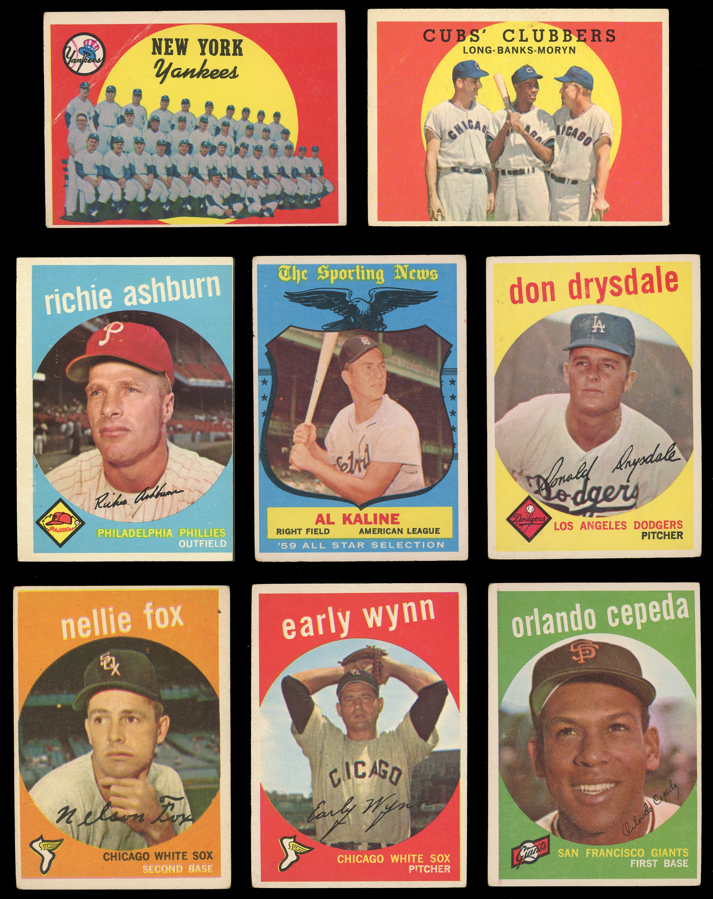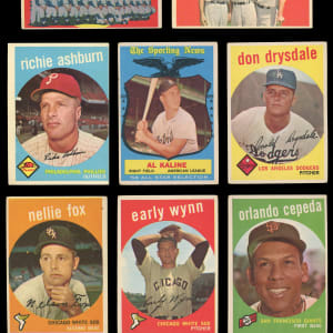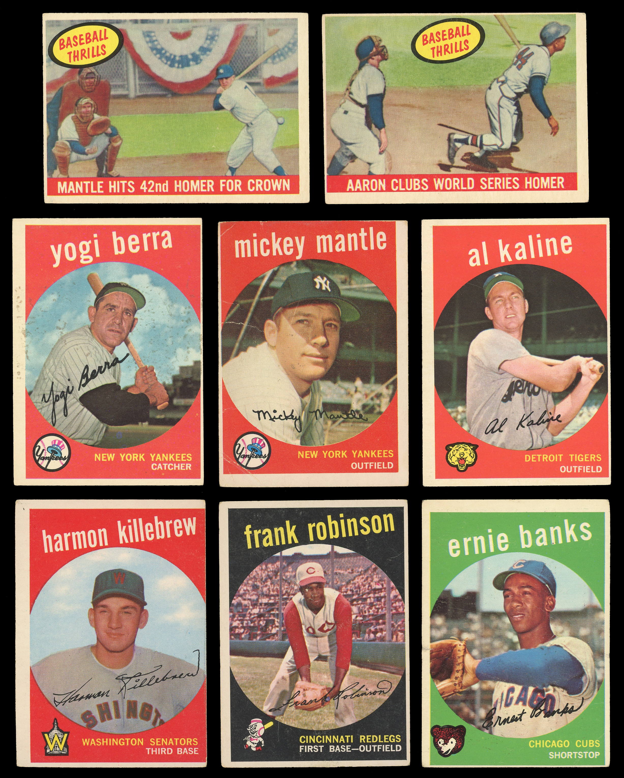 Get a head start on the 1959 Topps edition with the offered starter set of (143/572) different featuring (30+) Hall of Famers. These grandstand stars generally present in the (GD to VG) range and is bolstered by (8) tougher high numbers. Highlights include: #1 Frick (FR), #8 Phillies Team (marked), #10 Mantle (PR), #20 Snider (GD), #40 Spahn (GD), #180 Berra (VG), #212 Aaron/Mathews (FR), #300 Ashburn (VG), #317 Ashburn/Mays (VG), #350 Banks (FR), #360 Kaline (VG), #387 Drysdale (GD), #408 N. Fox/Aparicio (VG), #435 F. Robinson (GD), #461 Mantle HR (VG), #464 Mays Catch (FR), #467 Aaron HR (GD), #510 Yankees Team (FR), #515 Killebrew (GD) and #562 Kaline AS (GD).