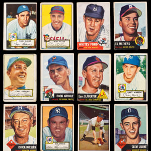 1952 Topps: (54 cards, average FR with 37% paper loss) with #67 Reynolds (PR, bb), #88 Feller (PR), #175 B. Martin RC (PR, paper loss), #191 Berra (GD), #250 Erskine (PR, paper loss);