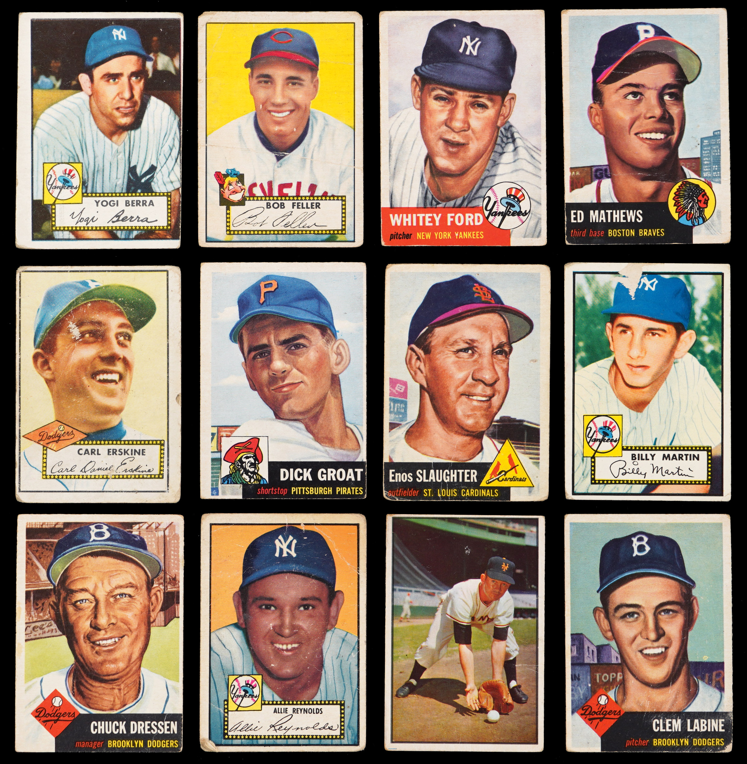 1953 Topps: (63 cards, average FR with 19% paper loss including 3 high numbers) with #14 Labine (GD), #37 Mathews (PR), #41 Slaughter (FR), #50 Dressen (VG), #154 Groat (GD), #207 Ford (GD)