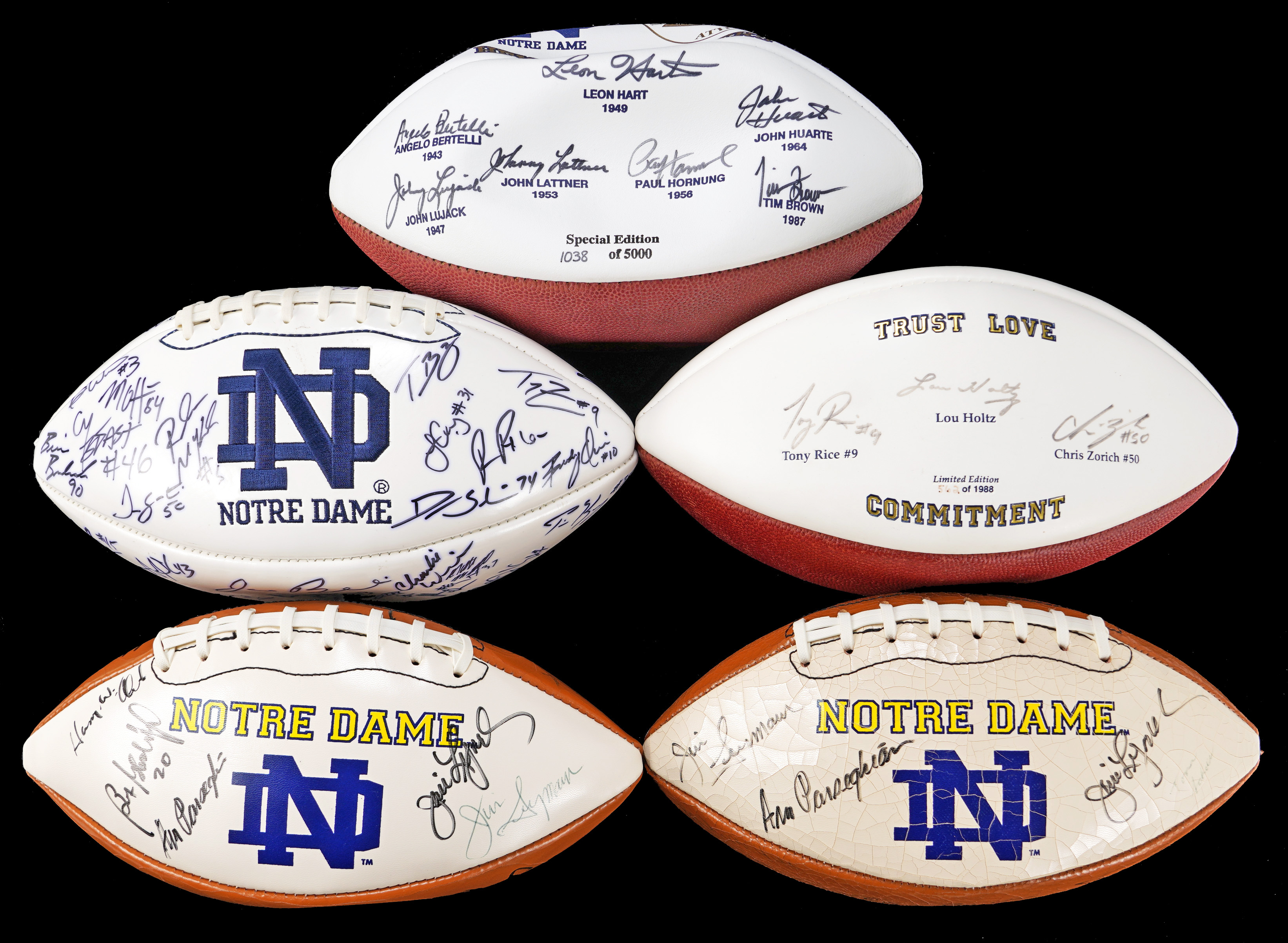 Notre Dame/Downtown Athletic Club “Heisman Winners” Football - Special Edition (1038/5000). Signed by (7) Fighting Irish Heisman Award winners on the white panel that has their names and award-winning years: Angelo Bertelli 1943, John Lujack 1947, Leon Hart 1949, John Lattner 1953, Paul Horning 1956, John Huarte 1964, Tim Brown 1987. Signatures average (“8-9”).