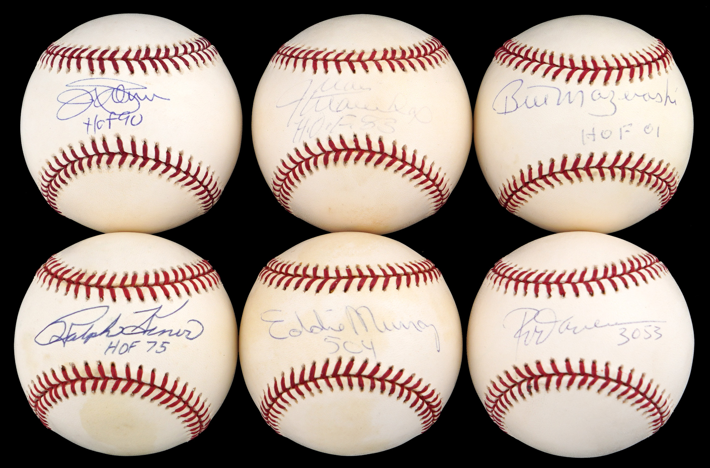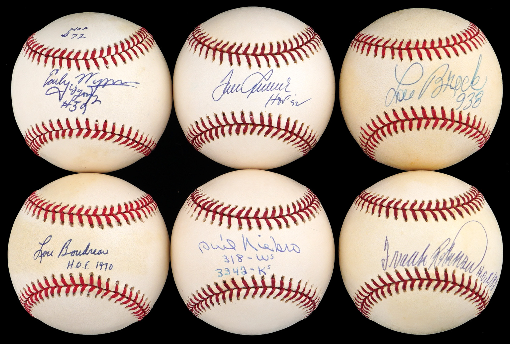 Sweet collection of (13) Hall of Fame single-signed baseballs with each displaying career achievements as inscriptions. The average ("8-9") autographs are neatly placed on the sweet spots of balls that mostly display limited toning with some much better. Includes: OAL: (4 balls) with Boudreau (H.O.F. 1970), Doerr (HOF 86), F. Robinson (H.O.F. 82), Wynn (HOF 72, Cy Young #39); ONL: (3 balls) withBrock (938), Kiner (HOF 75), Seaver (HOF 92, very clean ball); OML: (6 balls) with Carew (3053), Marichal (very light, H.O.F. 83),Mazeroski (HOF 01), Murray (504), Niekro (318-Ws 3342-Ks) and Palmer (HOF90). Auction LOA from James Spence/JSA.