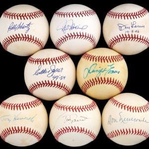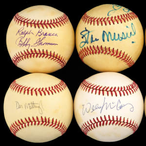 Archive of (14) dual/single-signed baseballs featuring only Hall of Famers and stars. Unless noted, the average ("8-9") autographs are expertly placed on the sweet spots of OAL, ONL and OML spheres. Interesting career achievements are also applied by two players as inscriptions. The majority of balls display varying degrees of surface toning. Includes: Branca/Thomson, Dw. Evans, Gooden (early), Henrich, Joost (47-'54), Larsen (10.8.56), Lasorda (Rawlings Official League), Mattingly, McCovey, Musial (sweet spot)/B. Robinson (north panel), Newcombe (clean!), Palmeiro (OML, very clean!), Rose and Shantz. Auction LOA from James Spence/JSA.