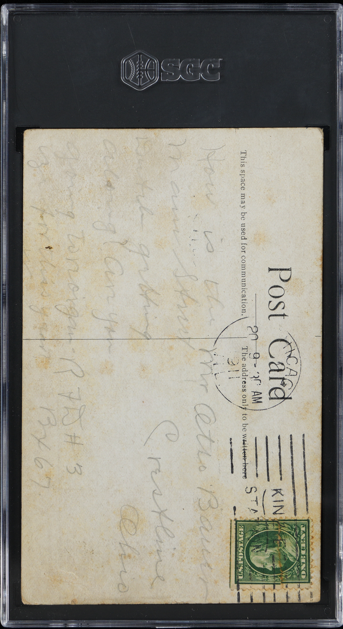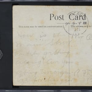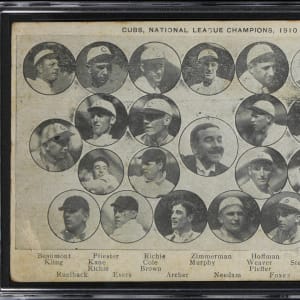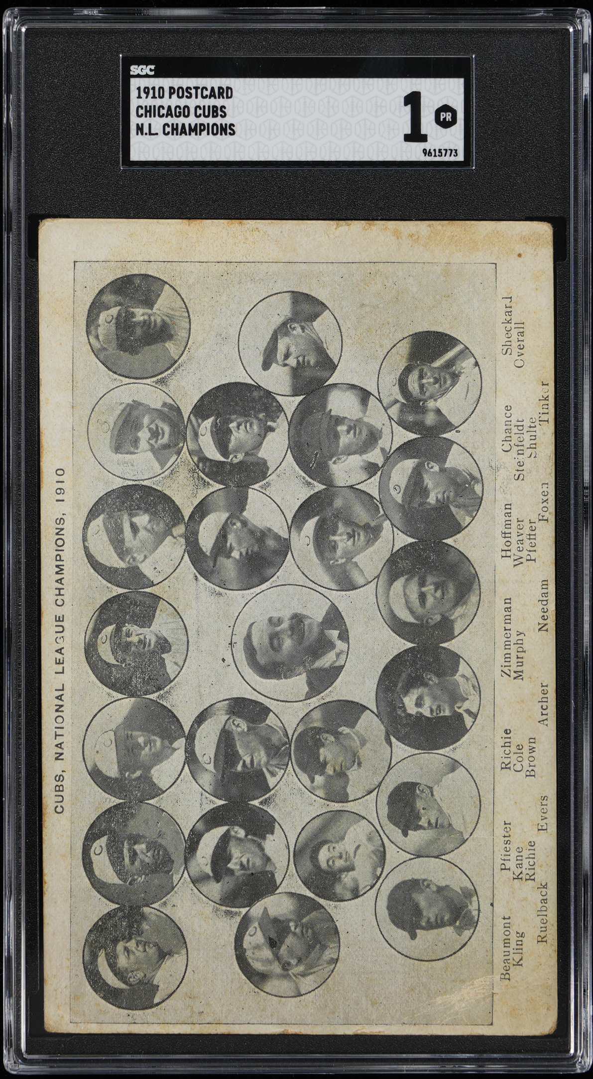 Graded POOR 1 by SGC. "Baseball's Sad Lexicon" and (21) teammates are captured on the offered 1910 Chicago Cubs National League Champions team composite postcard. Postmarked from 1911, the correspondence section of this black-and-white heirloom displays legible pencil writing. Otherwise, the black-and-white cameos have sustained only moderate corner/edge wear along with expected surface staining. Players include: Archer, Beaumont, M. Brown, Chance, Cole, Evers, Foxen, Hofman, Kane, Kling, Murphy, Needham, Overall, Pfeffer, Pfeister, Reulbach, (2) Richie, Schulte, Sheckard, Steinfeldt, Tinker, Weaver and Zimmerman.