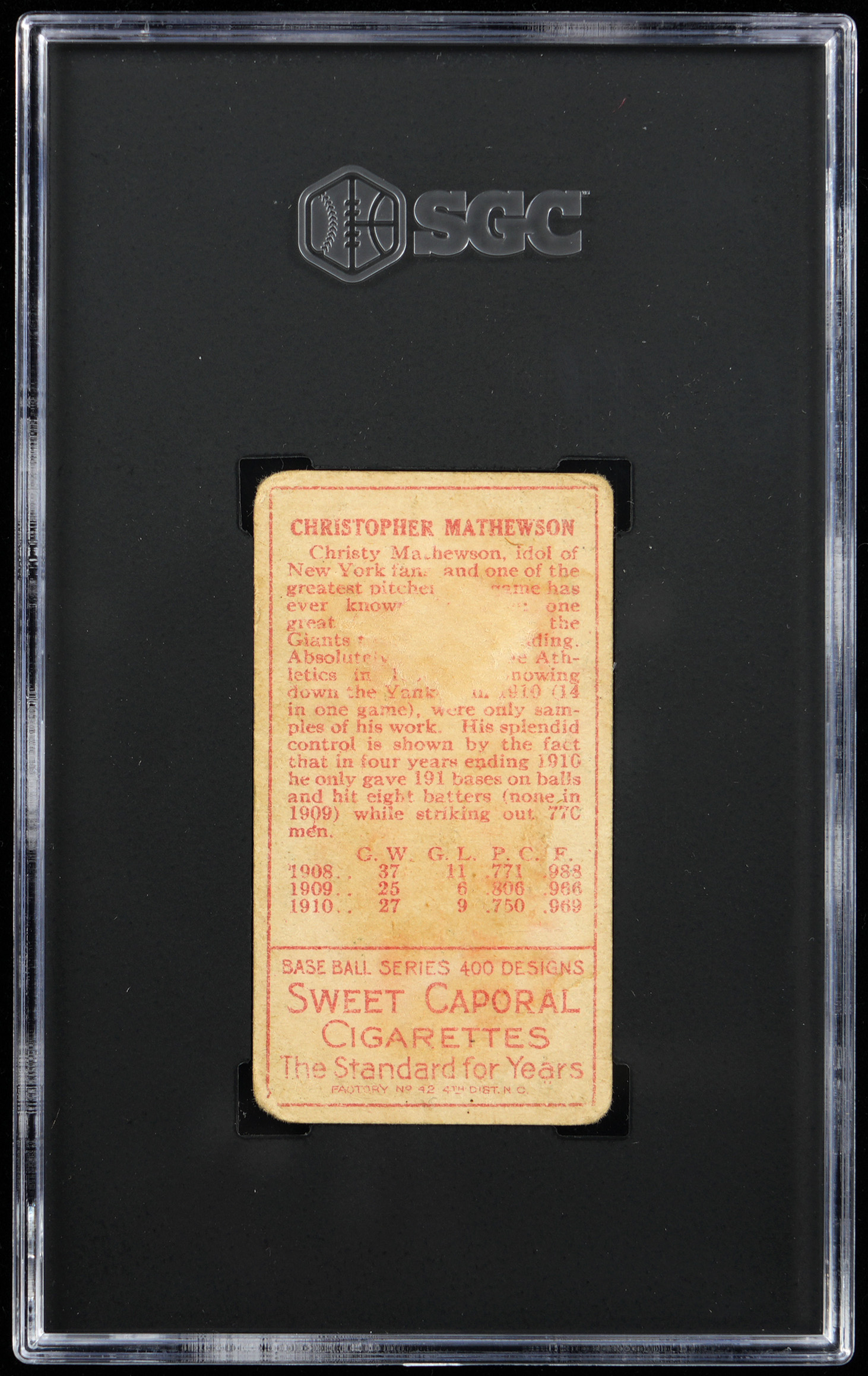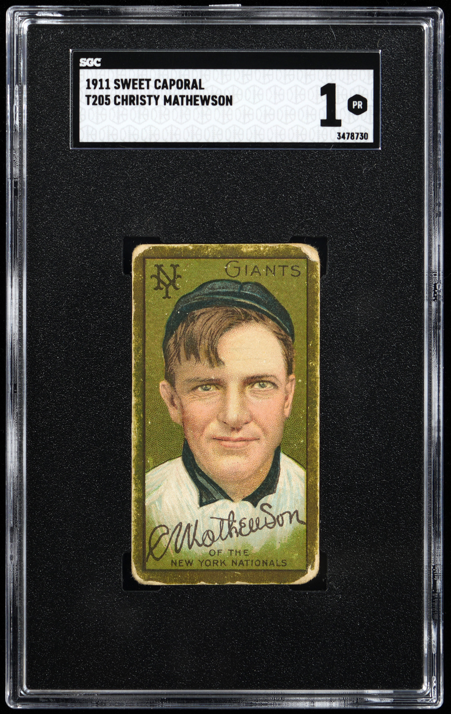 Class of 1936 Hall of Famer! Graded POOR 1 by SGC. "The Idol of New York fans" casts a confident gaze on the offered 1911 T205 Gold Border Christy Mathewson portrait. With exception to a patch of reverse paper loss on the red Sweet Caporal advertising back, this moderately worn illustration of the New York Giants ace displays only moderate, but not excessive wear. A perfect choice for those seeking a playing-era tobacco card of "The Christian Gentleman" without breaking the bank.