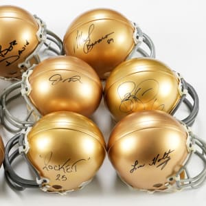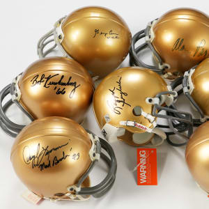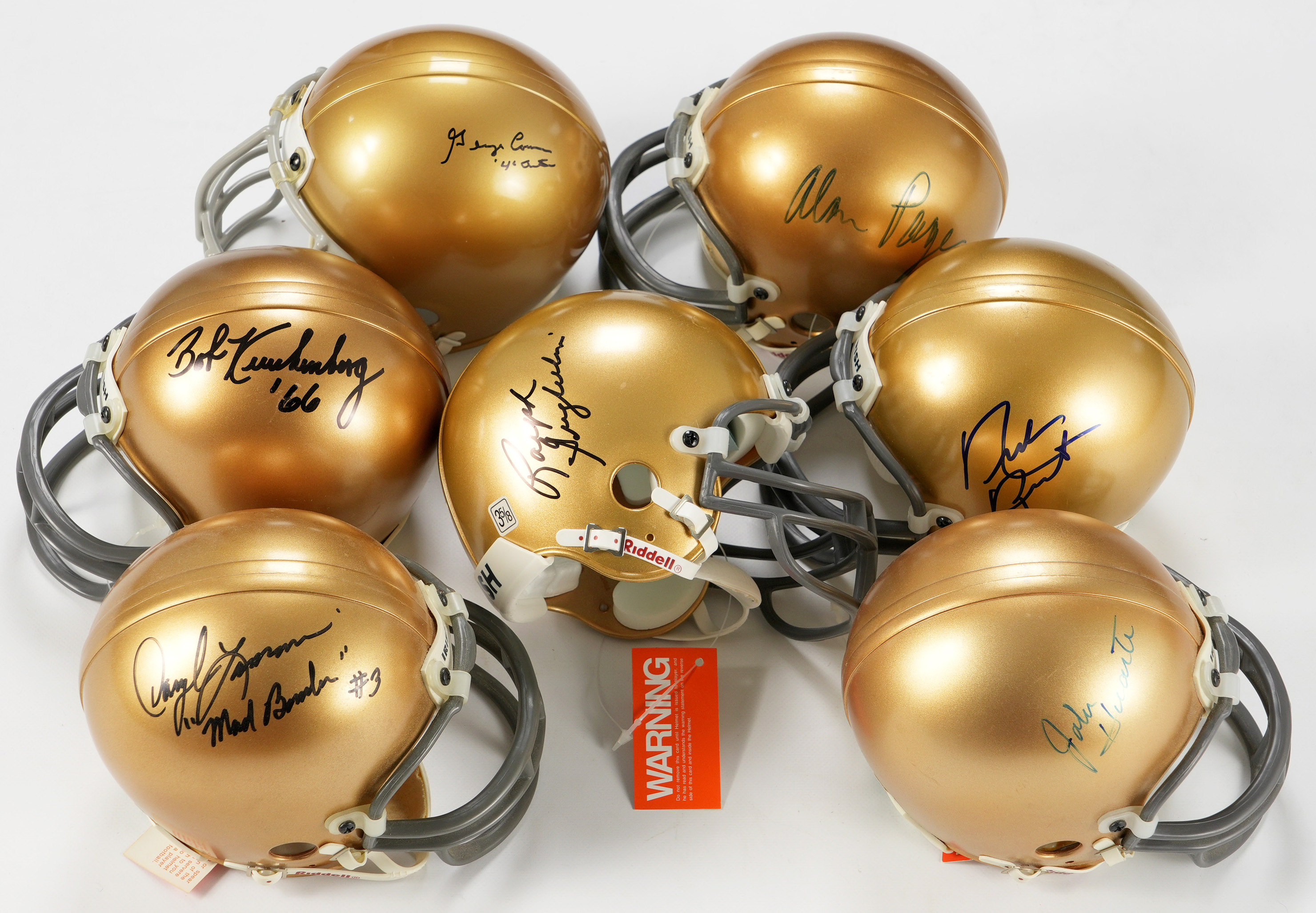 "Golden Dome" legends including NFL Hall of Famers, national champions and fan favorites dominate with these (26) Notre Dame Football single-signed mini helmets. These Riddell helmets are each penned in Sharpie with the autographs overwhelmingly projecting ("9-10") strength. Several players have added jersey numbers of overall career anecdotes as inscriptions. Includes: Auction LOA from James Spence/JSA: (15 helmets) with Bavaro, Bettis, Bleier (Capt '67, Nat. Champs '66, #28), Buoniconti, Connor, Davies (Notre Dame LOA), Guglielmi, Holtz (Notre Dame LOA), Huarte, Kuchenberg, Ismail ("Rocket" 25 only), Lamonica ("Mad Bomber" #3), Montana, Page, Watters; No JSA but Presumed Authentic: (11 helmets) with Beuerlein, Bryant, Casper, Clements ("73 Champs"), Edwards, Mays, C. Miller, T. Rice (with T. Rice signed LOA), Snow, B. Williams and Ziegler.