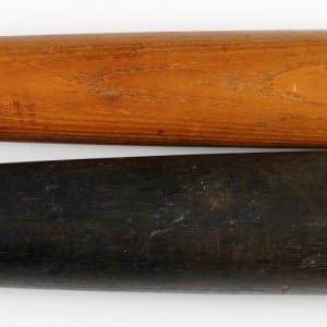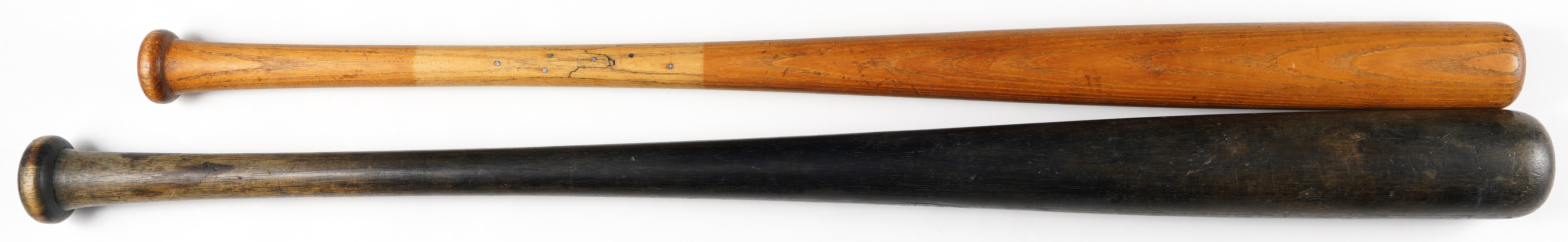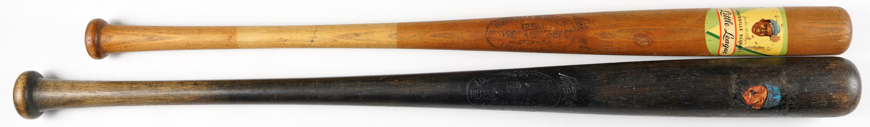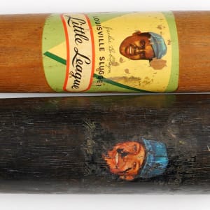 The decal on the barrel of the Robinson bat has Jackie's face with Jackie Robinson facsimile signature below, and “Louisville Slugger - Little League.” The decal has some scuffing from use, like the rest of the bat, but is still bright, readable and 95% intact. 32-inches long with “32” on the knob, the cracked handle has been repaired with five nails.