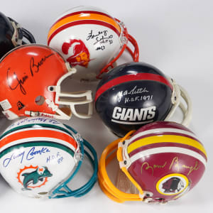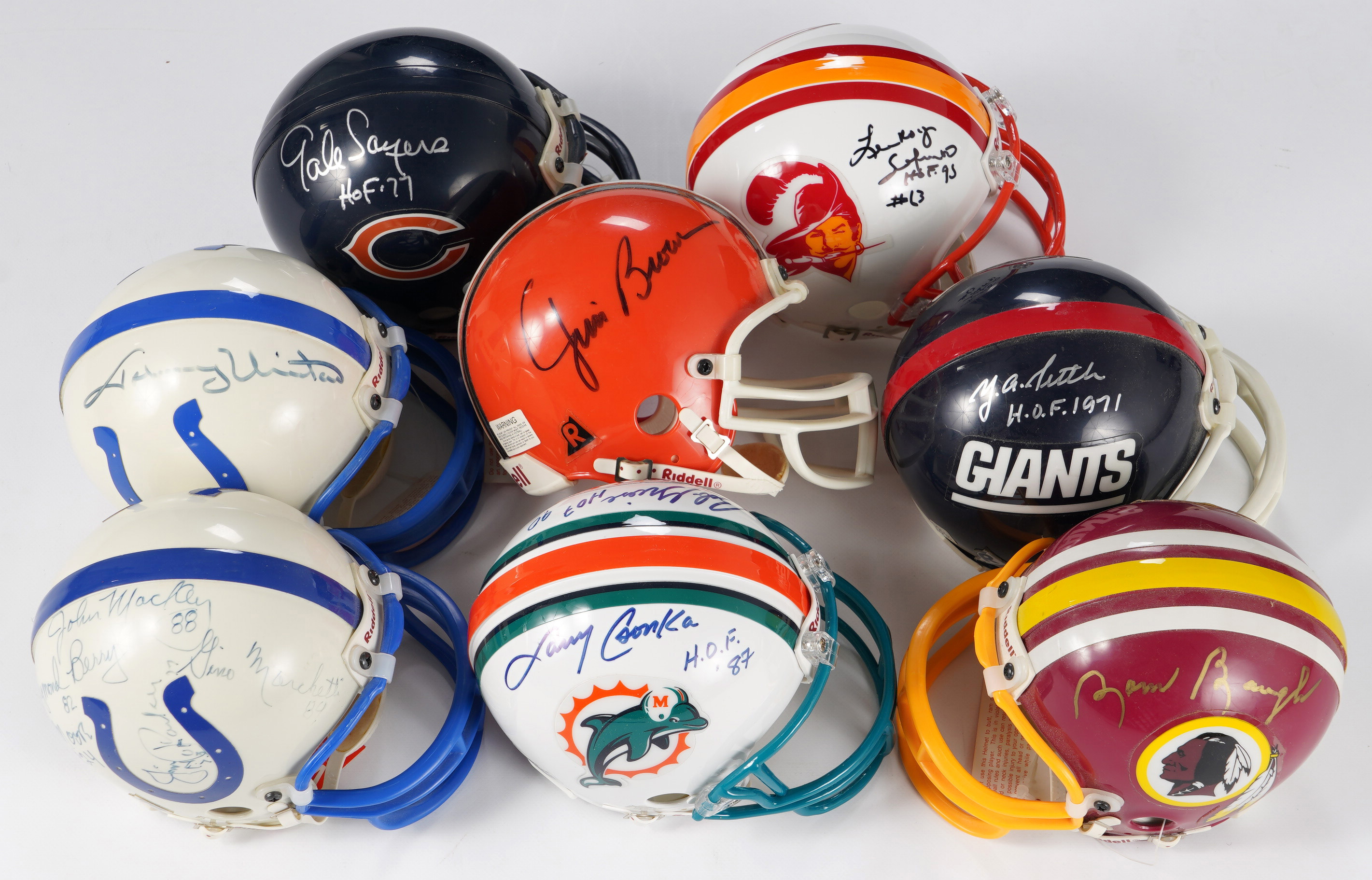 Hard-hitting collection of (33) Football Hall of Fame signed mini helmets. The average ("9") Cantonian autographs are neatly placed on clean Riddell toppers. Additionally, several players added induction dates or other career accomplishments as inscriptions. Includes: Auction LOA from JSA: (8 helmets) with Multi-Signed Baltimore Colts: (5 autographs, average "7-8") with Berry, Mackey, Marchetti, L. Moore, Parker; Multi-Signed Miami Dolphins: (2 autographs) with Csonka, Griese; Single-Signed Helmets: (6 helmets) with Baugh, J. Brown, Sayers, Selmon, Tittle, Unitas; No JSA but Presumed Authentic: (25 helmets) with Adderley, Barney, DeLamielleure, Gatski, Ji. Johnson, Joiner, L. Kelly, Langer, Lanier, Lary, Matson, McElhenny, Mix, Motley, Otto, Perry, Ringo, Schmidt, Shaw, J. Smith, Trippi, D. Walker, Wilcox, Willis and Yary. Auction LOA from James Spence/JSA. The size/weight of this item requires that there will be an additional shipping charge for this lot.