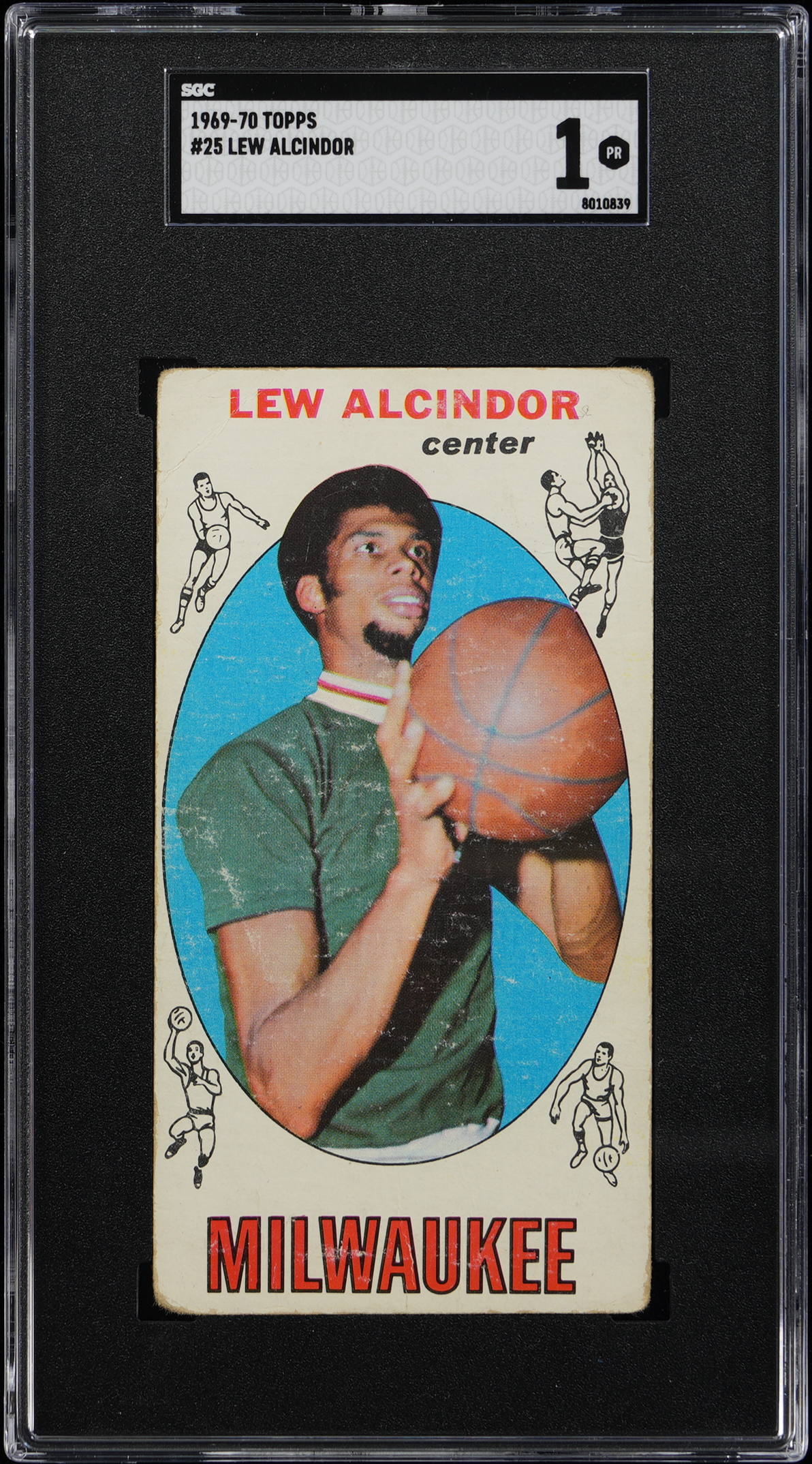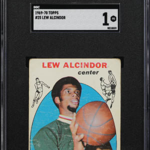 Graded POOR 1 by SGC. The future Kareem Abdul-Jabbar is portrayed on the offered 1969-1970 Topps Basketball #25 Lew Alcindor rookie card. Milwaukee Bucks Hall of Famer.