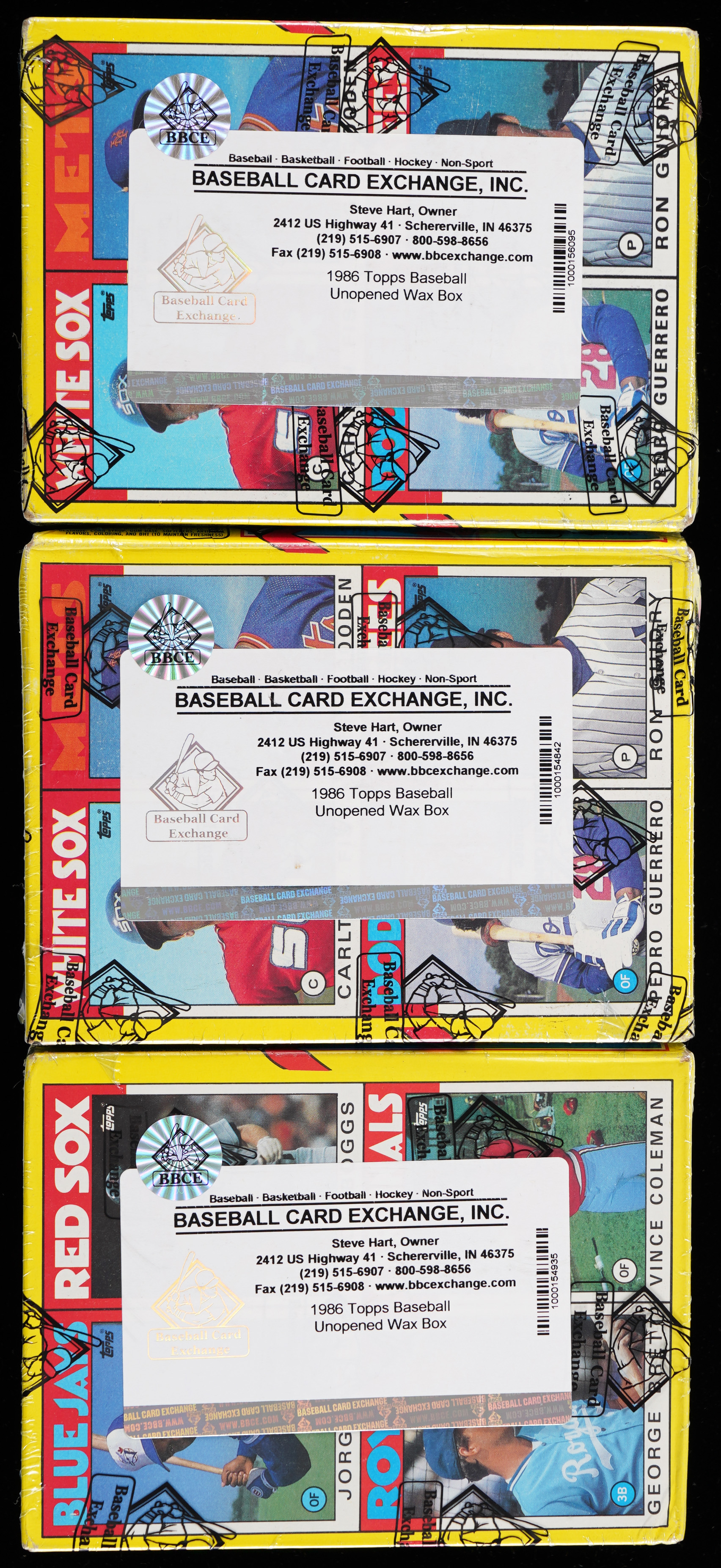 Offered is a 1986 Topps unopened wax box trio. These condition sensitive cartons each contain 36/15-card packs plus a stick of bubble gum per. Each box comes shrink-wrapped by Baseball Card Exchange (owned by Steve Hart, the foremost expert on unopened material).