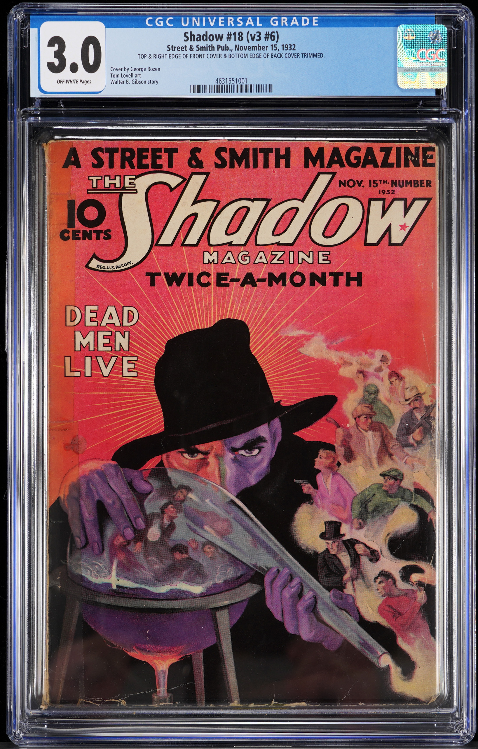 Something sinister is cooking in this 1932 Street & Smith The Shadow #18 (volume 3, #6) pulp magazine, titled "Dead Men Live". Issues from the Shadow's first year of print in 1931, are quite scarce, and issues from 1932-1934 are cited as uncommon. Dated November 15, 1932, this issue falls in the uncommon date range. Prized for its classic cover, this early issue depicts the mysterious Shadow pouring the story's characters from a laboratory vial, in a cloud of vapor. Perhaps the mysterious vigilante has brought the dead back to life, as the title implies.