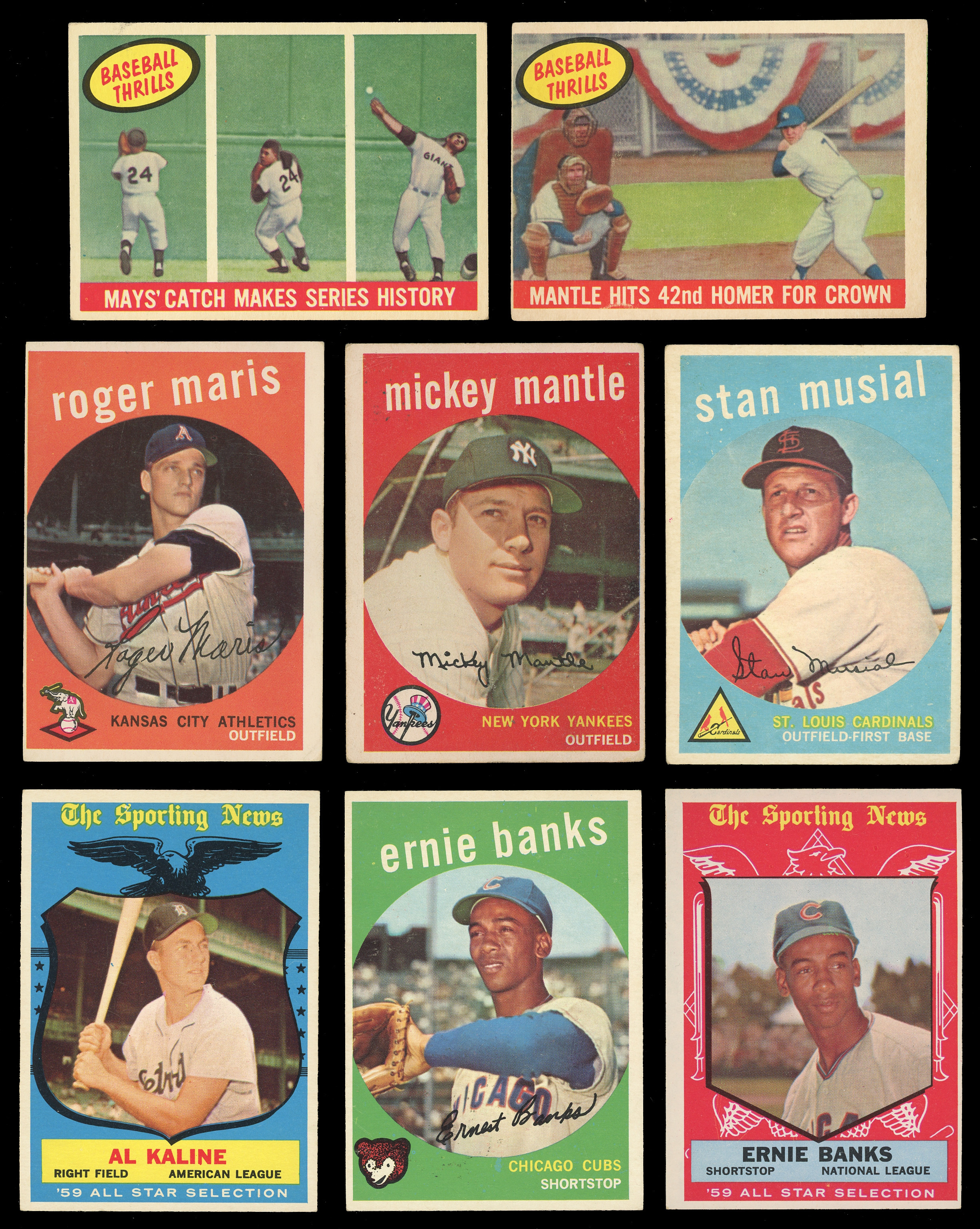 Close out the fifties with the offered 1959 Topps partial set of (349/572) cards featuring a pair of Mantle examples along with a strong core of additional Hall of Fame talent. This mid-grade assembly generally presents in the (VG to VG-EX) range with the (28) tougher high series generally presenting similarly. Highlights include: #10 Mantle (GD), #20 Snider (VG-EX), #150 Musial (VG), #202 Maris (VG), #212 Aaron/Mathews (VG-EX), #317 Ashburn/Mays (VG), #350 Banks (EX), #360 Kaline (VG-EX), #387 Drysdale (VG-EX), #408 N. Fox/Aparicio (VG-EX), #430 Ford (VG-EX), #461 Mantle HR (VG), #464 Mays Catch (VG), #467 Aaron HR (VG), #509 Cash RC (EX), #510 Yankees Team (FR), #528 Pirates Team (marked), #559 Banks AS (VG-EX), #560 Aparicio AS (VG), #562 Kaline AS (VG-EX) and #571 Spahn AS (VG).