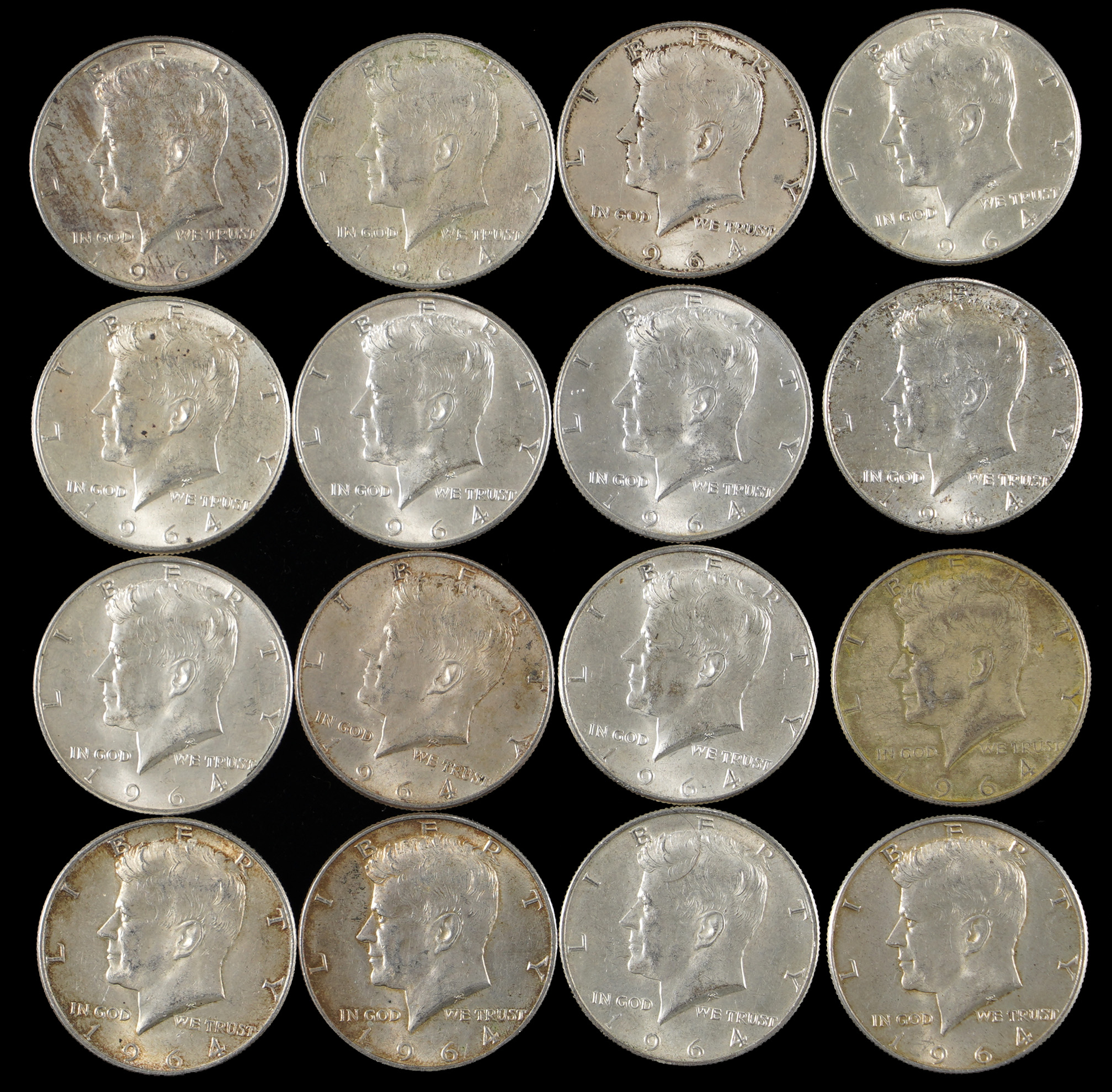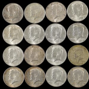 Silver seekers stop here, for this 1964-1974 Kennedy half dollar bundle (147). This accumulation is long on silver coins, with (61) 1964 90% silver type, and (61) 1965-1970 40% silver type, adding up to considerable value. The balance are (25) 1971-1974 clad type coins. Condition is favorable throughout, ranging 90% AU to BU, 10% lesser.