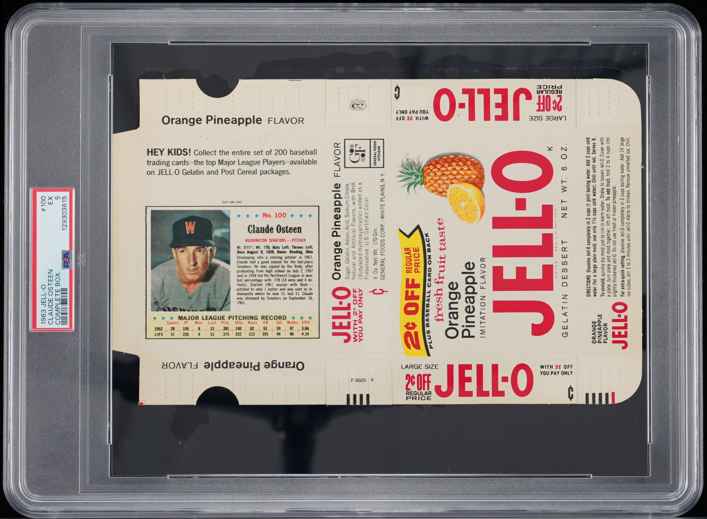 Only 2 Graded! Graded EX 5 by PSA. Superior 1963 Jell-O complete box featuring shortprint #200 Claude Osteen of the Washington Senators. This lovely food issue never retailed and presents almost as when it rolled off the presses during the JFK administration. A beautiful display piece! Note: Most graded examples from this issue are factory unfolded. The offered rarity is "stretched" and never underwent any part of the manufacturing process.