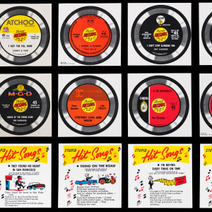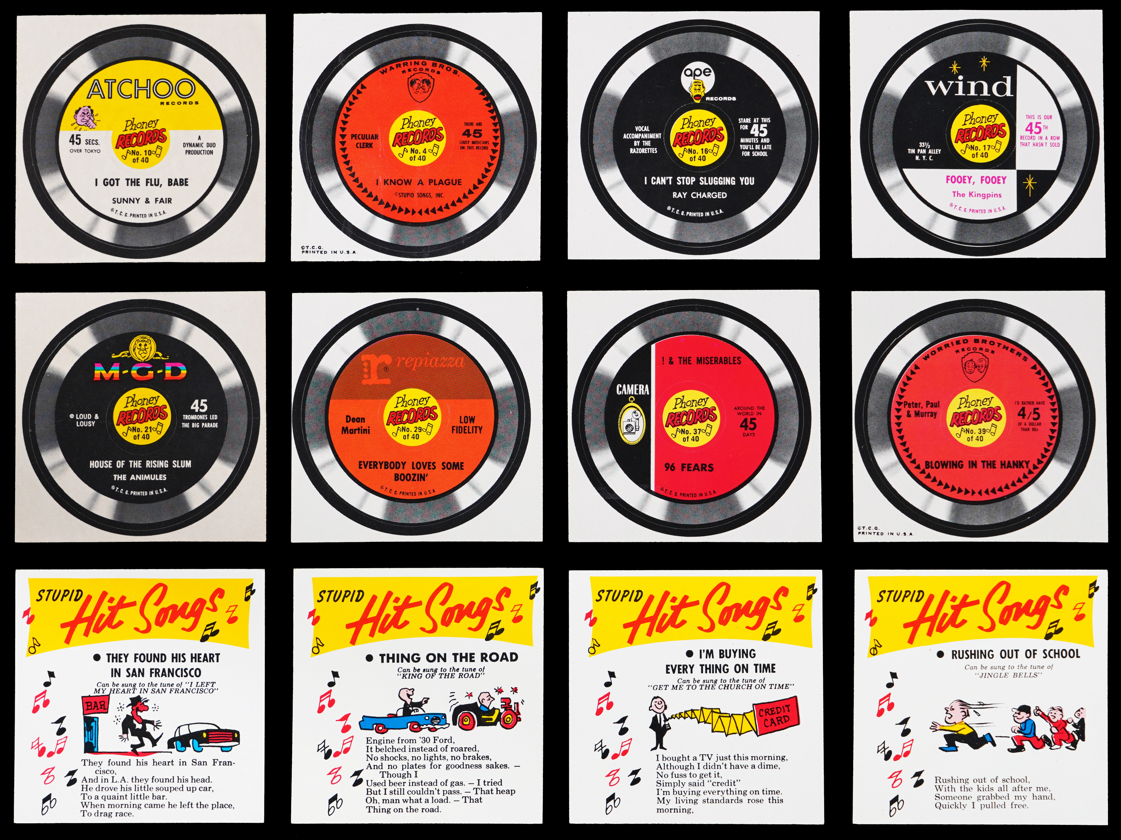 1968 Topps Phoney Records/Stupid Hits Songs near-complete set, with record stickers (37/40), and song cards (15/16); plus duplicates: stickers (27), and cards (19). Sized with odd dimensions of 3-3/8" x 3-3/8", these square format stickers and cards are bright, clean, and attractive, ranging 90% EX to NM+, 10% lesser, again with deference to a small percentage with rubber band dents.
