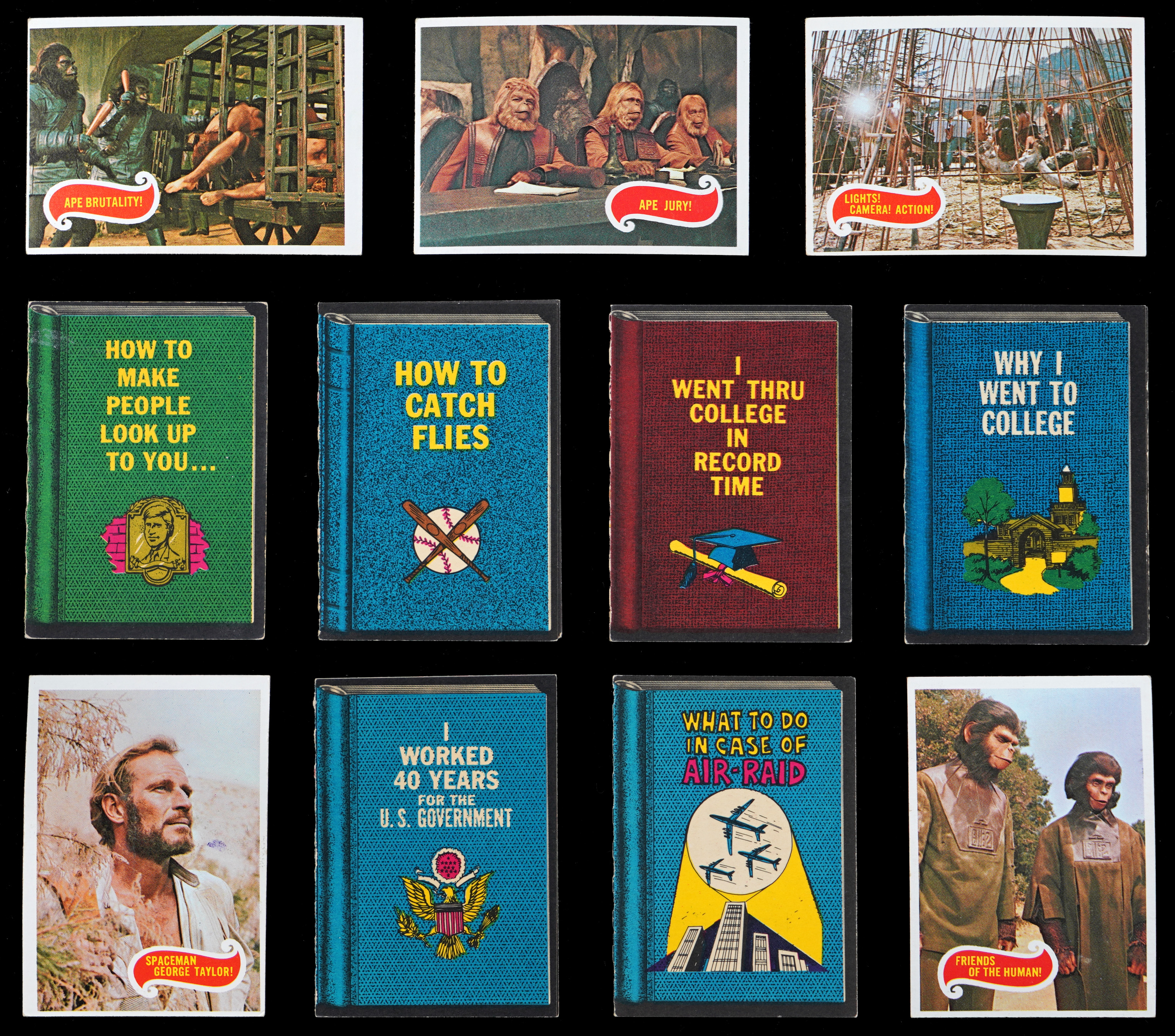 1969 Topps Planet of the Apes near-complete set (43/44). Based on the classic Sci-Fi adventure starring Charlton Heston, these standard issue trading cards feature scenes from the ground-breaking film. Condition ranges VG-EX to EX-MT, with deference to rubber band dents on the first and last cards.