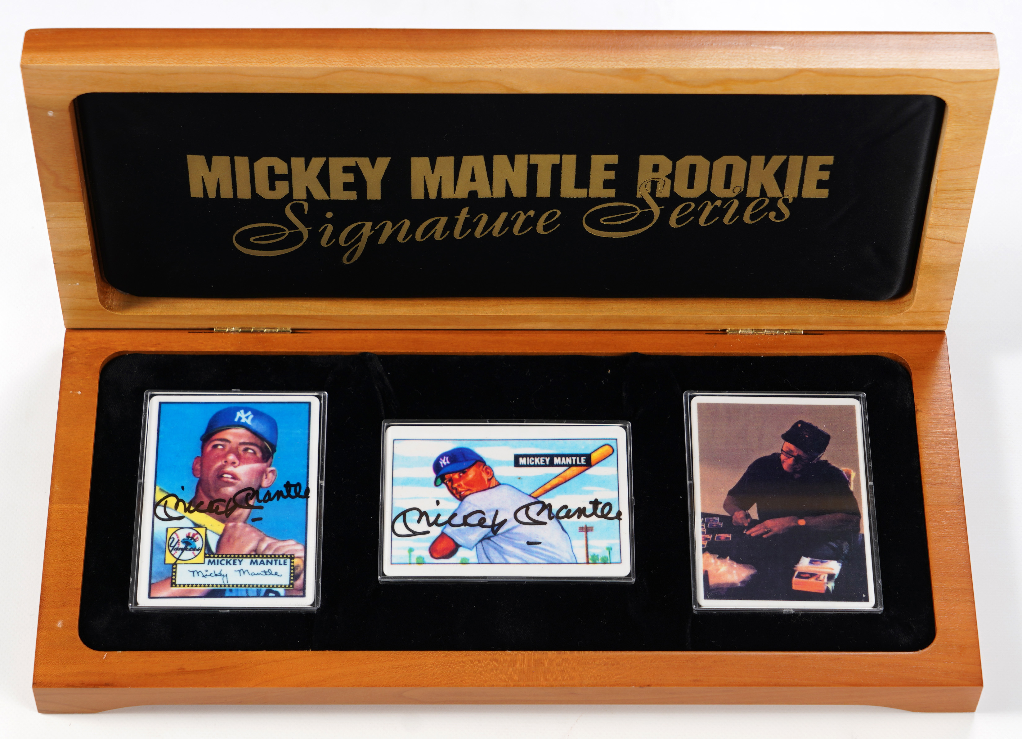 Declare yourself a bona fide Mickey Mantle collector, with the acquisition of this 1995 R&N China signed rookie card set (2). Housed in a deluxe wood presentation case, this stunning porcelain set is from a limited-edition of "536", matching Mantle's career home run total. These porcelain ceramic cards recreate Mantle's 1951 Bowman rookie card, and his 1952 Topps rookie card. Mantle has signed both like-new cards as boldly as possible, and the results are very pleasing. Joined with the (2) signed cards, is a COA card, also fashioned in porcelain, with an obverse photograph of Mantle taken while he was signing the 536 total sets in this edition. The date of this signing event is stated as "May 5-7, 1995", which was just three month's prior to the beloved Hall of Fame slugger's demise.