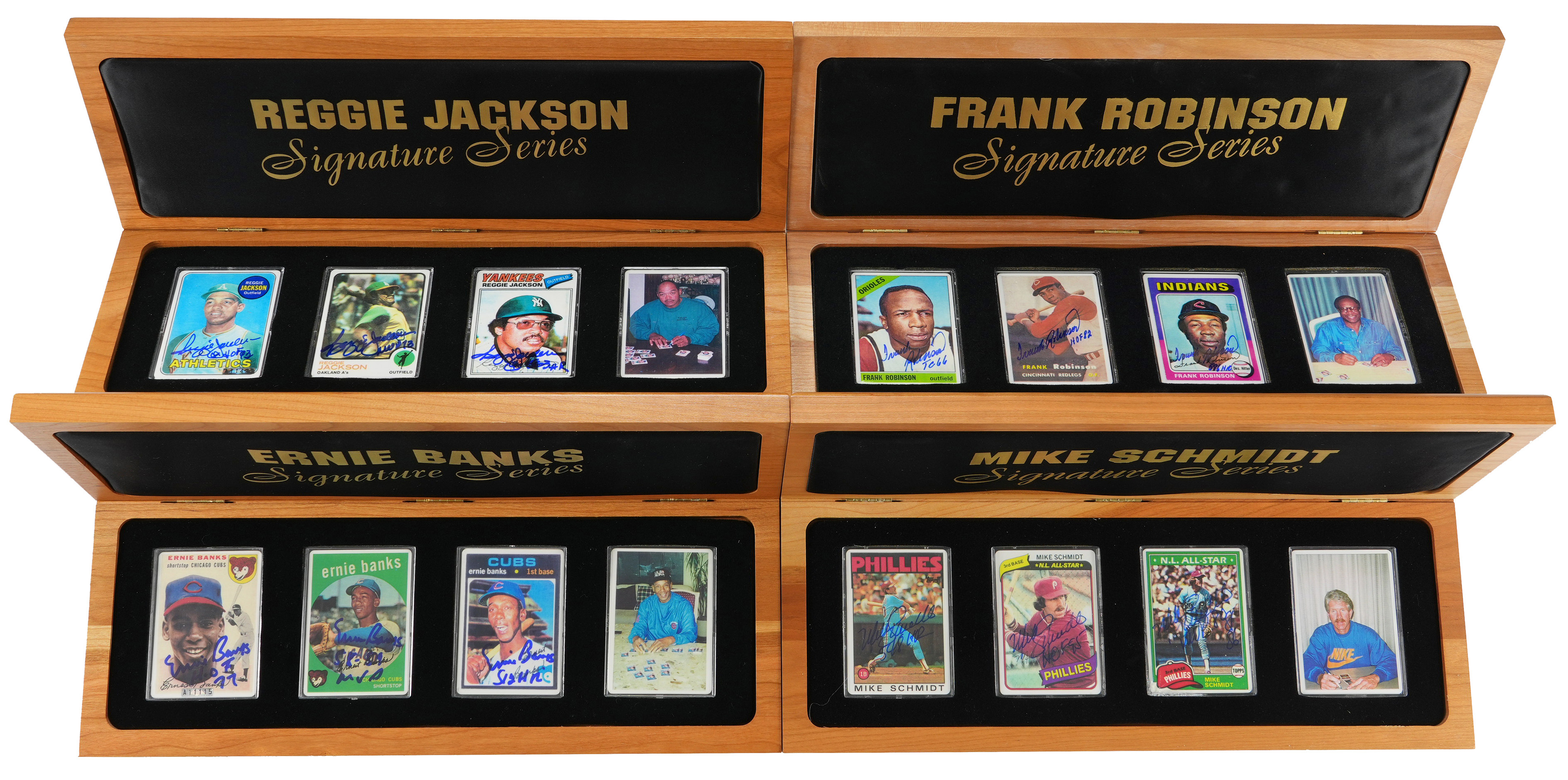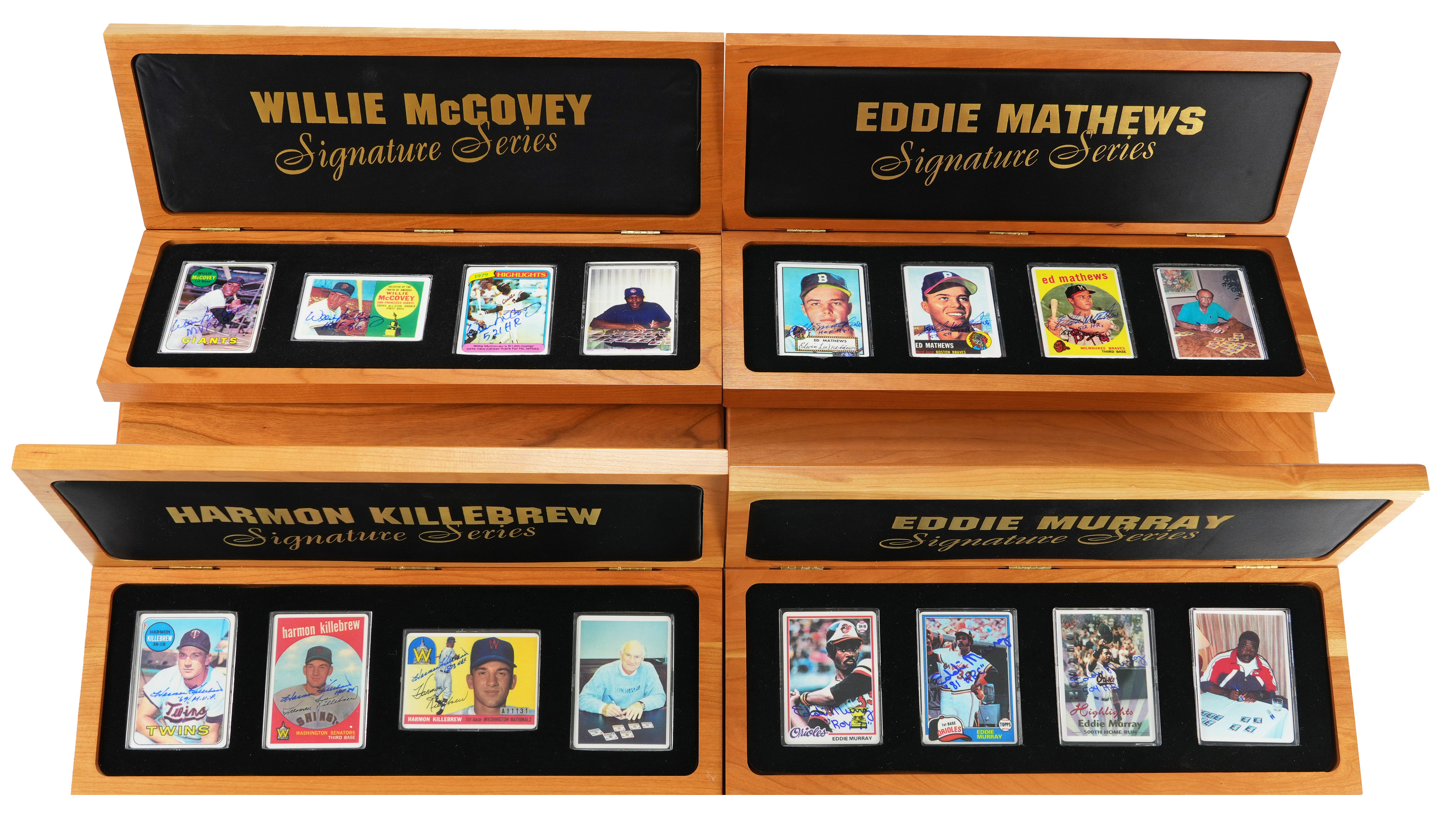 500 Home Run Club Members who battered opposing pitching staffs are showcased with the offered 1995 R&N China Signature Series collection of (8) 3-card sets (plus porcelain photos of the players signing the replicas). Manufactured by R&N China, these thin porcelain plates measure slightly larger than standard-card size and are licensed under the Topps banner. The career spanning replicas of the Hall of Famers are housed in a handsome 16-3/4 x 6" wooden display box with fitted velvet card slots and an informational sheet in a black outer case. Each plate is serially numbered to their career home run totals. The autographs are neatly penned in bold blue Sharpie with career achievements added as inscriptions. The player signed three-card sets totaling (24) autographs include the following immortals: (3) Banks, (3) R. Jackson, (3) Killebrew, (3) Mathews, (3) McCovey, (3) Murray (3) F. Robinson and (3) Schmidt. Auction LOA from James Spence/JSA. The size/weight of this item requires that there will be an additional shipping charge for this lot.