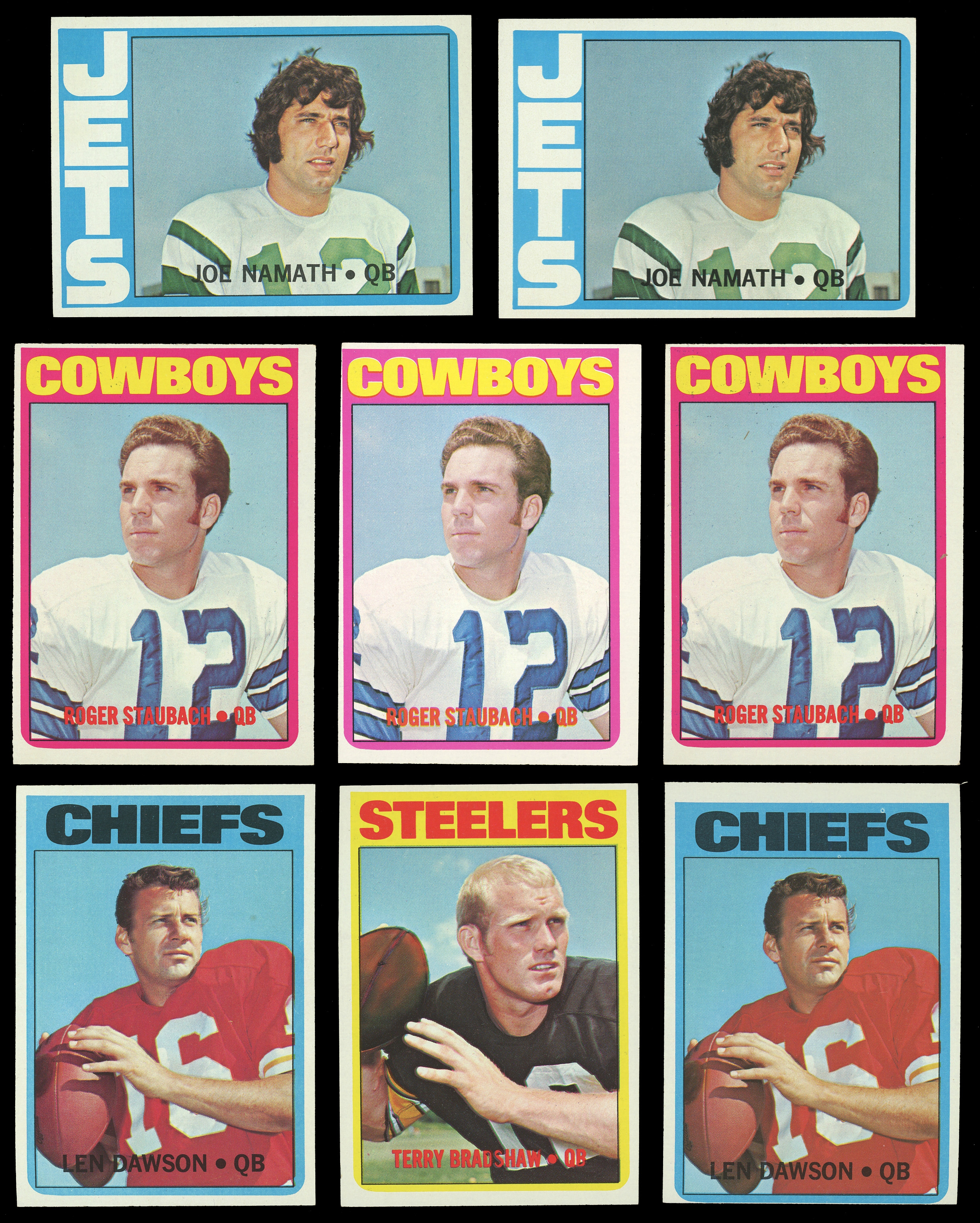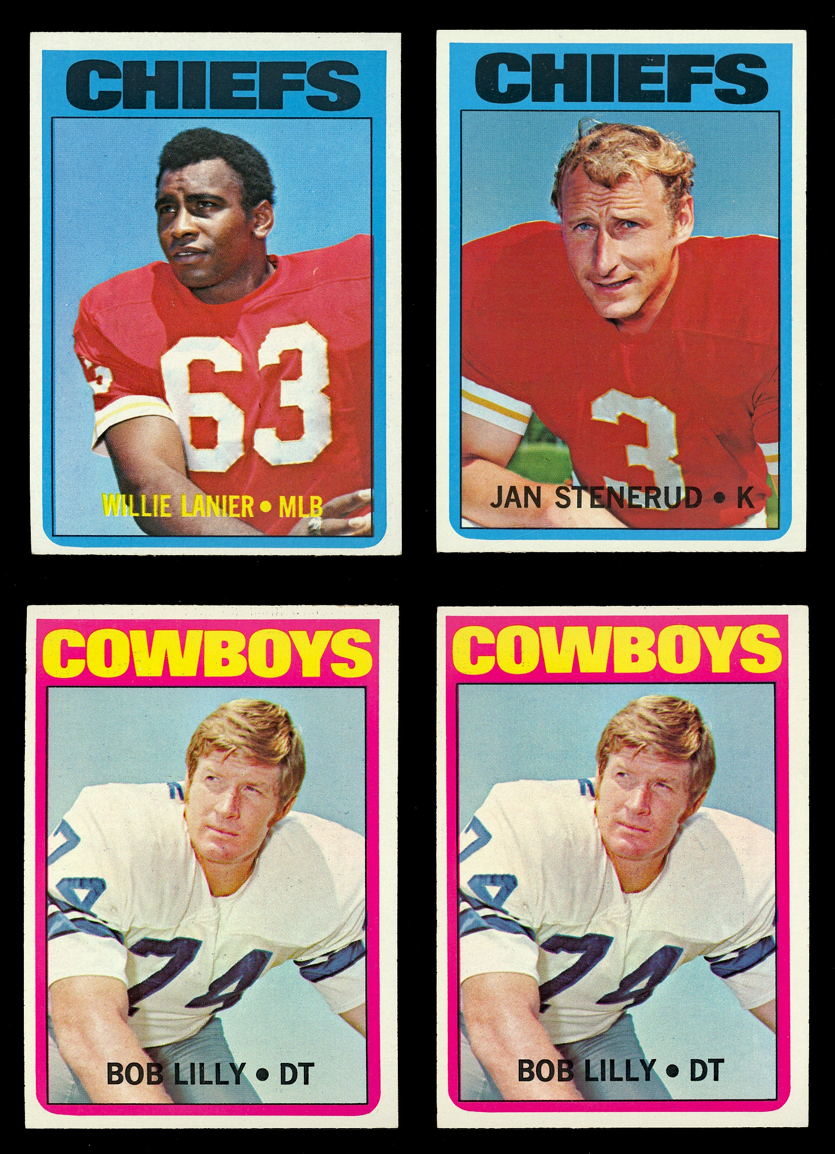 Gallery of (19) 1972 Topps Football Hall of Famers. Includes: #35 Lanier (EX), #61 Stenerud (EX), (3) #100 Namath (EX, (2) VG-EX), (2) #145 Lilly (EX, VG-EX), #150 Bradshaw (EX), (2) #170 Butkus (both EX-MT), (3) #200 Staubach RC (VG-EX, (2) VG), #205 L. Wilson (EX-MT), #209 D. Jones (VG-EX), #210 Biletnikoff (EX), #235 Blanda (EX-MT) and (2) #245 Dawson (EX-MT, VG).