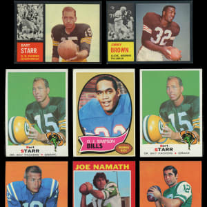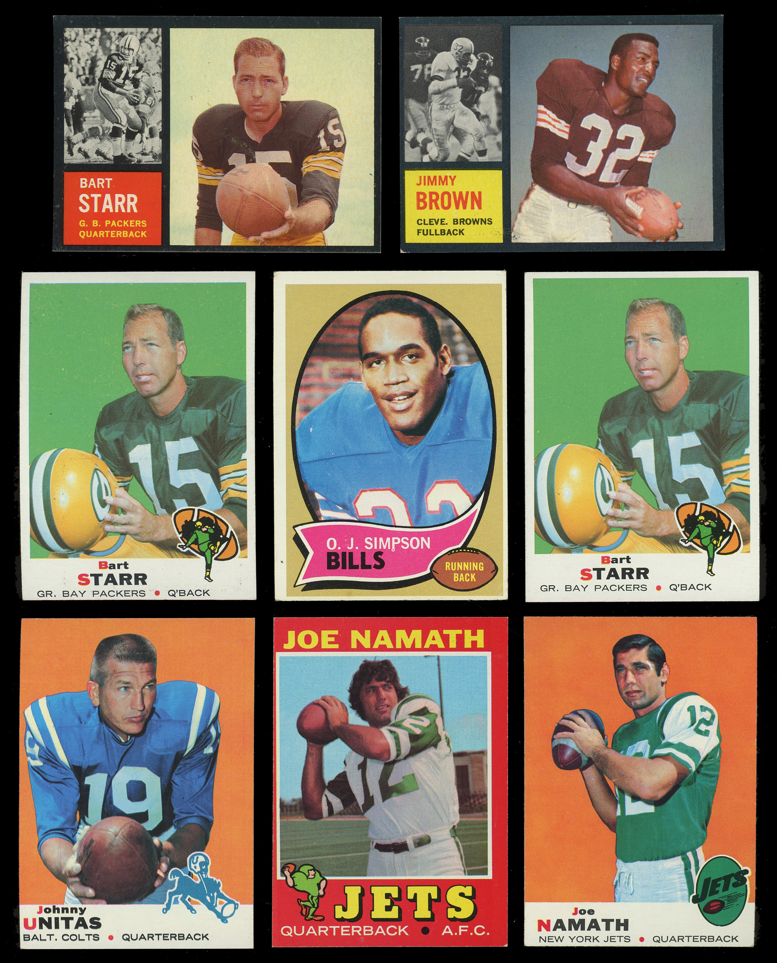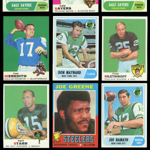 1968 Topps: (16 cards) with (4) #1 Starr (average VG), #65 Namath (VG-EX), (2) #75 Sayers (EX-MT, VG-EX), (2) #98 Cappelletti (EX, VG-EX), #157 Nitschke (VG-EX), (2) #168 Biletnikoff (EX-MT, VG-EX), #169 Maynard (EX), #181 Lilly (VG-EX), #194 Lamonica (VG-EX), #206 L. Kelly (VG);
