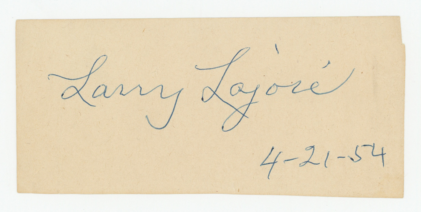 Get a late life autograph from a leading "dead ball" era hitter, with this Larry (Nap) Lajoie cut signature. Lajoie (HOF, d.1959) was eighty years old when he provided this satisfying signature, as evidenced by his "4-21-54" date inscription. Sized at 4-1/4" x 2", this fairly crisp cut would look great framed up with a photograph of the lifetime .338 batter.