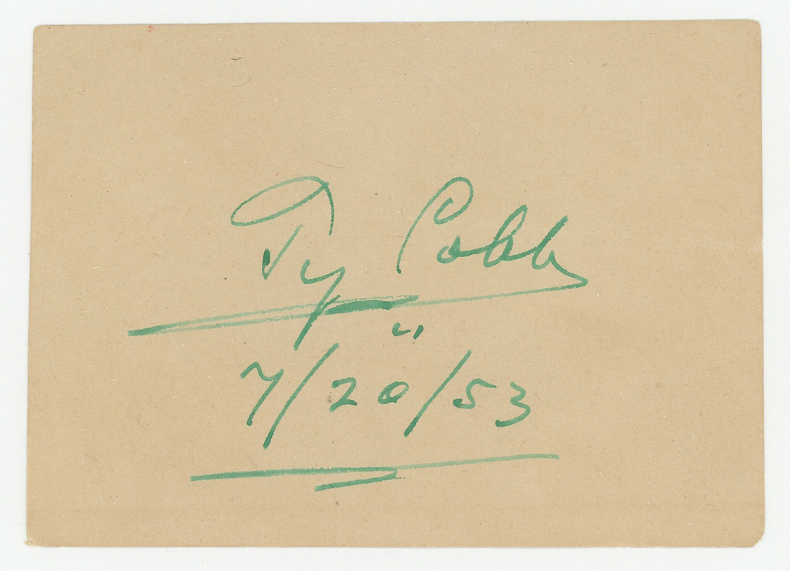 12-time batting leader Ty Cobb takes a swing at your collecting budget, with this dated cut signature. From 1907 through 1919, Cobb (HOF, d.1961) led the AL in batting every year except 1916, an extended period of hitting dominance that is unmatched. Sized at 3-1/2" x 2-1/2", this nicely preserved cut hosts a well-centered Cobb signature in his trademark green ink. Cobb has included the date inscription "7/20/53" with his distinct signature.