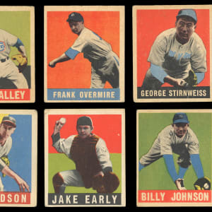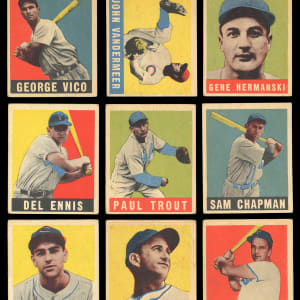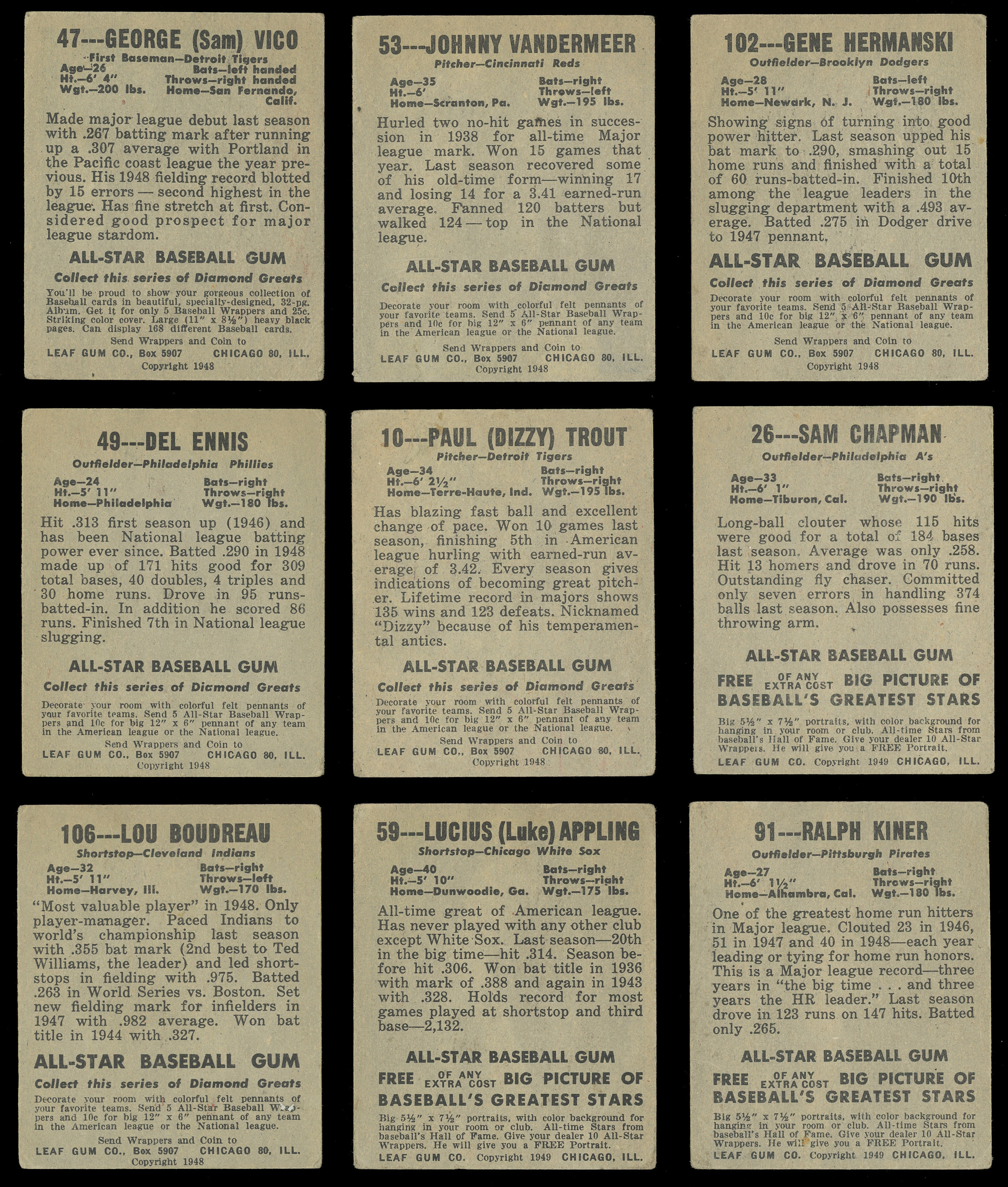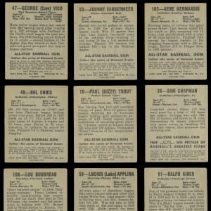 Sweet sixteen of 1948 Leaf Gum singles three four Hall of Famers. This mid-grade assembly generally presents in the (GD to VG) range with some better or lesser. Includes: #10, 14, 17, 22, 26, 47, 49, #53 Vander Meer (VG), #59 Appling (GD), 61, 77, 84, #91 Kiner RC (GD), 95, 102 and #106 Boudreau (GD).