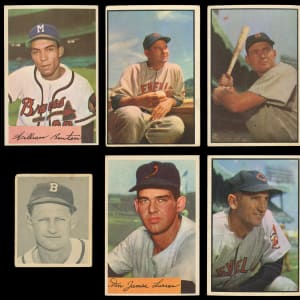1948 Bowman: (6 cards, average GD to VG) with #1 Elliott RC (GD), #4 Mize RC (VG), #47 Thomson RC (FR);