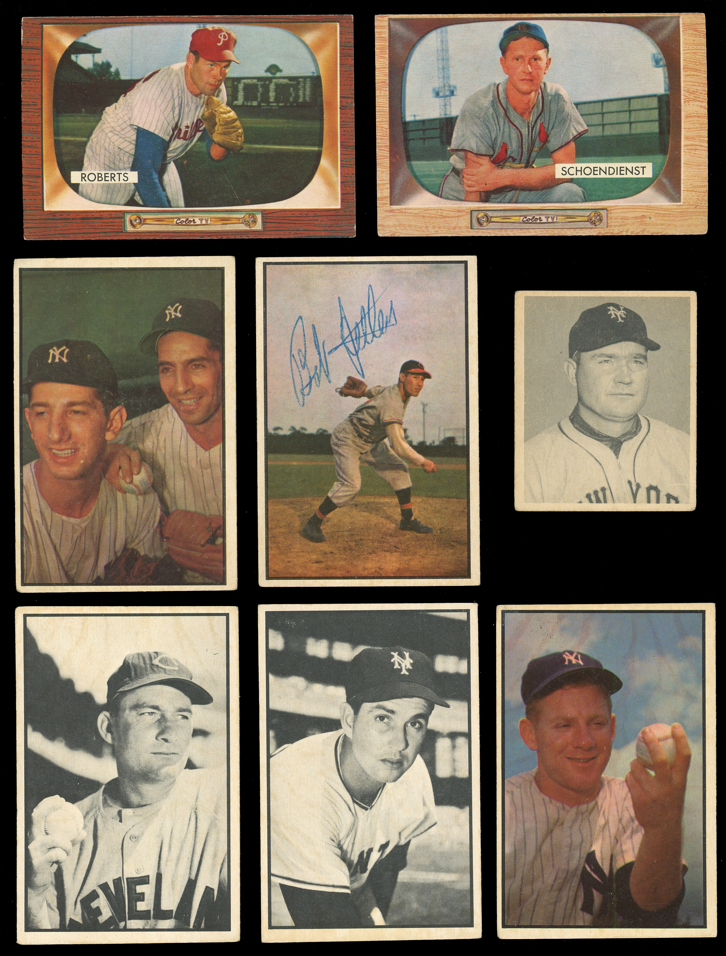 1953 Bowman Color: (41 cards, average GD to VG with moderate staining throughout, includes 29 high numbers) with #61 Kell (VG), #93 Rizzuto/B. Martin (GD), signed #114 Feller (card VG-EX, “8”, Auction LOA from James Spence/JSA), #143 Lopez (VG), #146 Wynn (GD), #153 Ford (GD, stain);