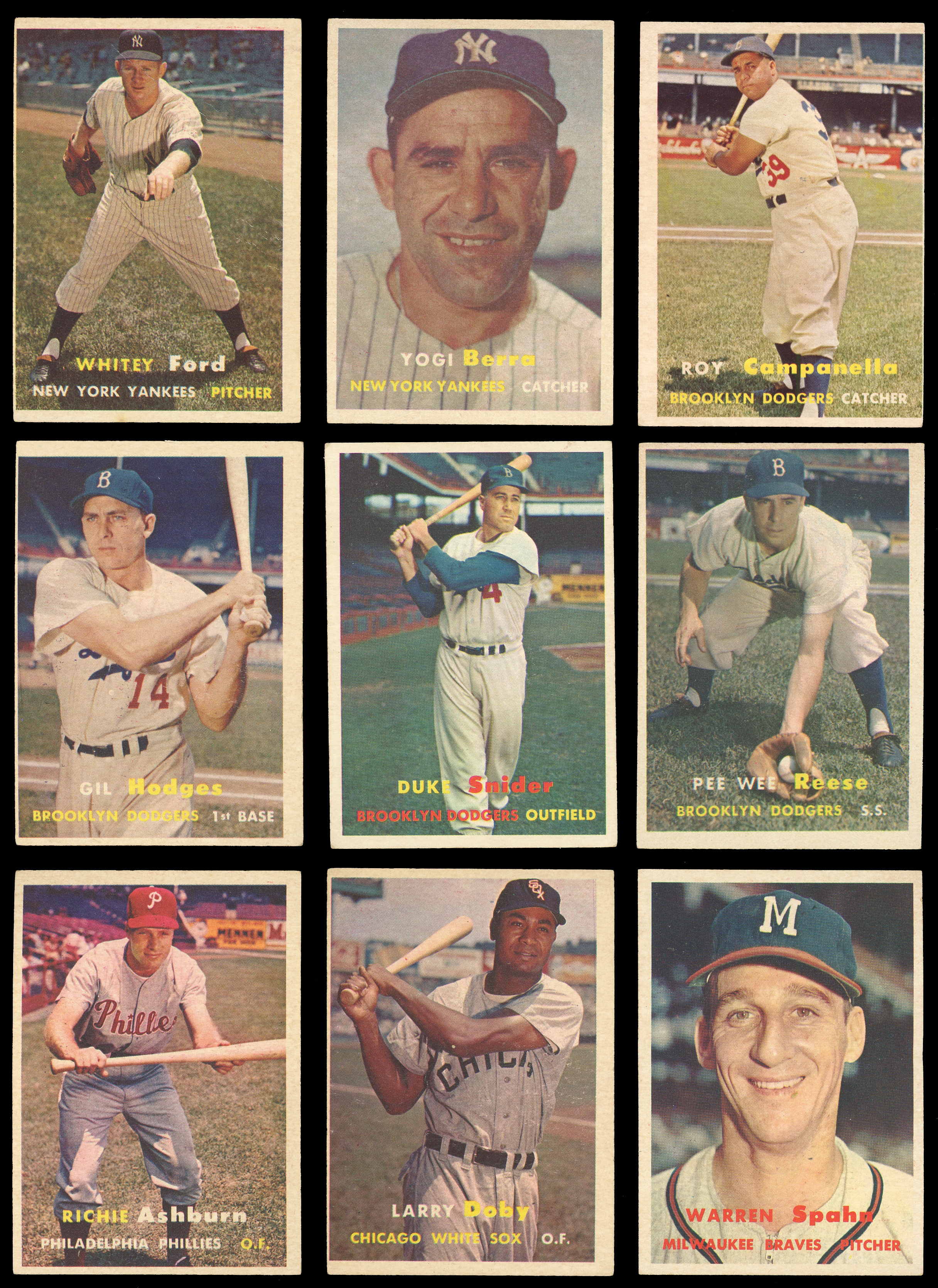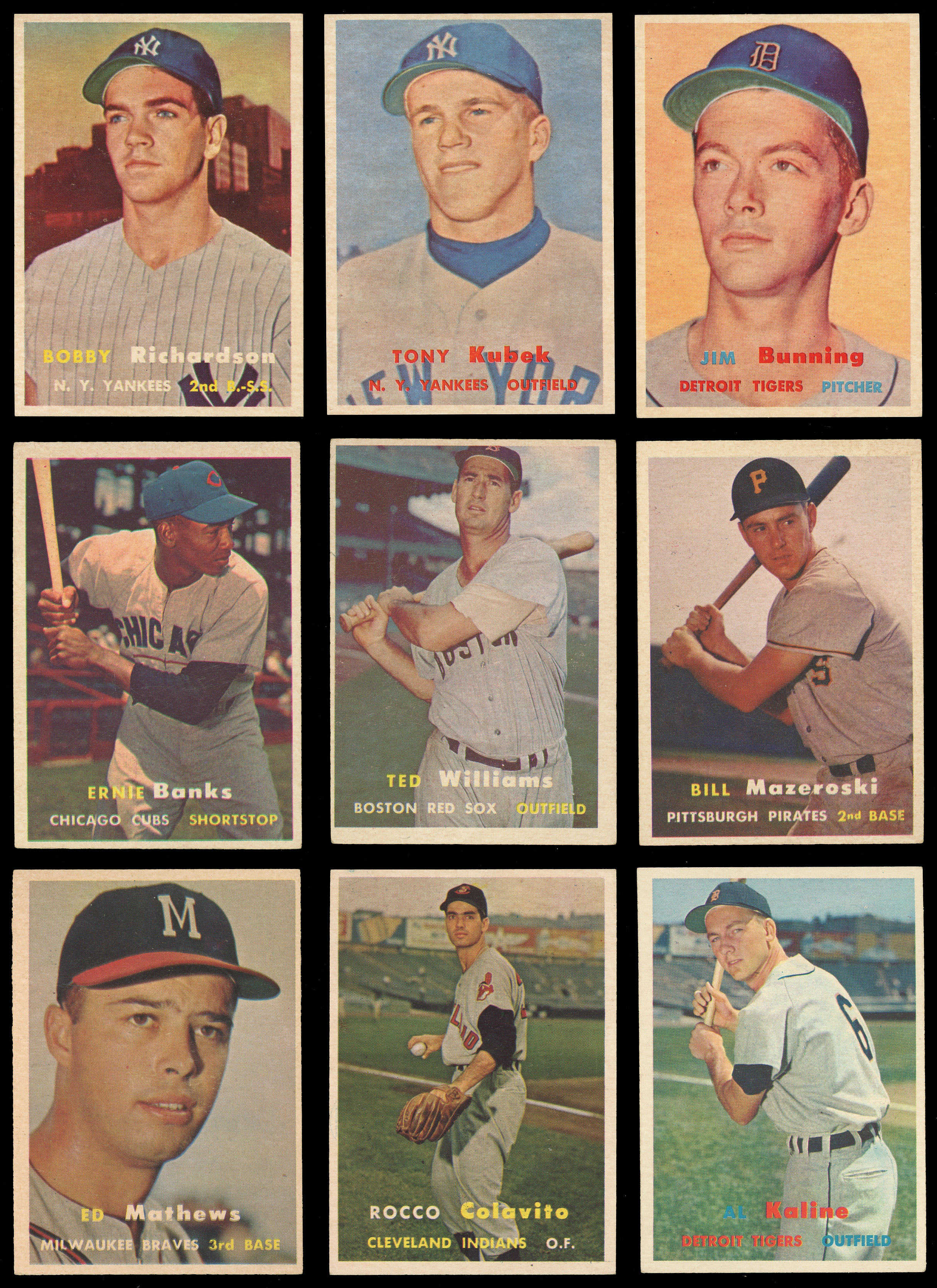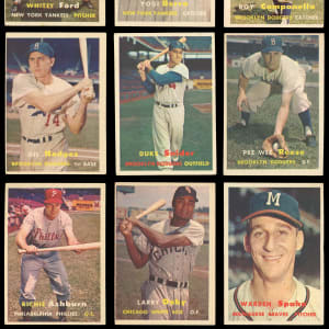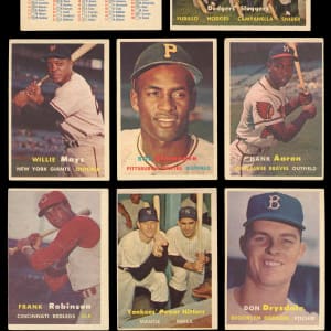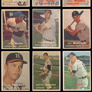 Groundbreaking 1957 Topps near set of (404/407) cards plus both checklists. This inaugural standard-sized issue has an approximate condition breakdown of 30% (EX-MT or better), 30% (EX), 20% (VG-EX) and 20% (VG or lesser) with the tougher fourth series generally presenting similarly, if not a touch better than the more available numbers. Highlights include: #1 T. Williams (VG), #2 Berra (EX-MT), #7 Aparicio (EX), #10 Mays (VG-EX), #15 Roberts (VG), #18 Drysdale RC (VG), #20 Aaron (GD), #24 Mazeroski RC (EX), #25 Ford (FR), #30 Reese (VG), #35 F. Robinson RC (VG), #55 Banks (VG-EX), #62 B. Martin (VG-EX), #70 Ashburn (VG-EX), #76 Clemente (VG), #80 Hodges (GD), #85 Doby (VG), #90 Spahn (PR, reverse paper loss), #97 Yankees Team (VG-EX), #125 Kaline (EX), #165 Kluszewski (GD), #170 Snider (VG-EX), #210 Campanella (VG), #212 Colavito RC (VG-EX), #215 Slaughter (EX), #250 Mathews (GD), #286 Richardson RC (NM), #312 Kubek RC (EX-MT), #317 Giants Team (EX-MT), #322 Reds Team (EX), #324 Dodgers Team (VG-EX), #338 Bunning RC (EX-MT), #400 Dodgers’ Sluggers (EX), #407 Mantle/Berra (VG) and NNO 1/2 Bazooka (marked). Missing only #95 Mantle, #302 Koufax and #328 B. Robinson for completion (available as separate lots elsewhere in this auction). Note: Due to storing methods in nine-pocket sheets, the front surfaces have a light film that doesn’t have a significant impact on the cards' overall presentation.