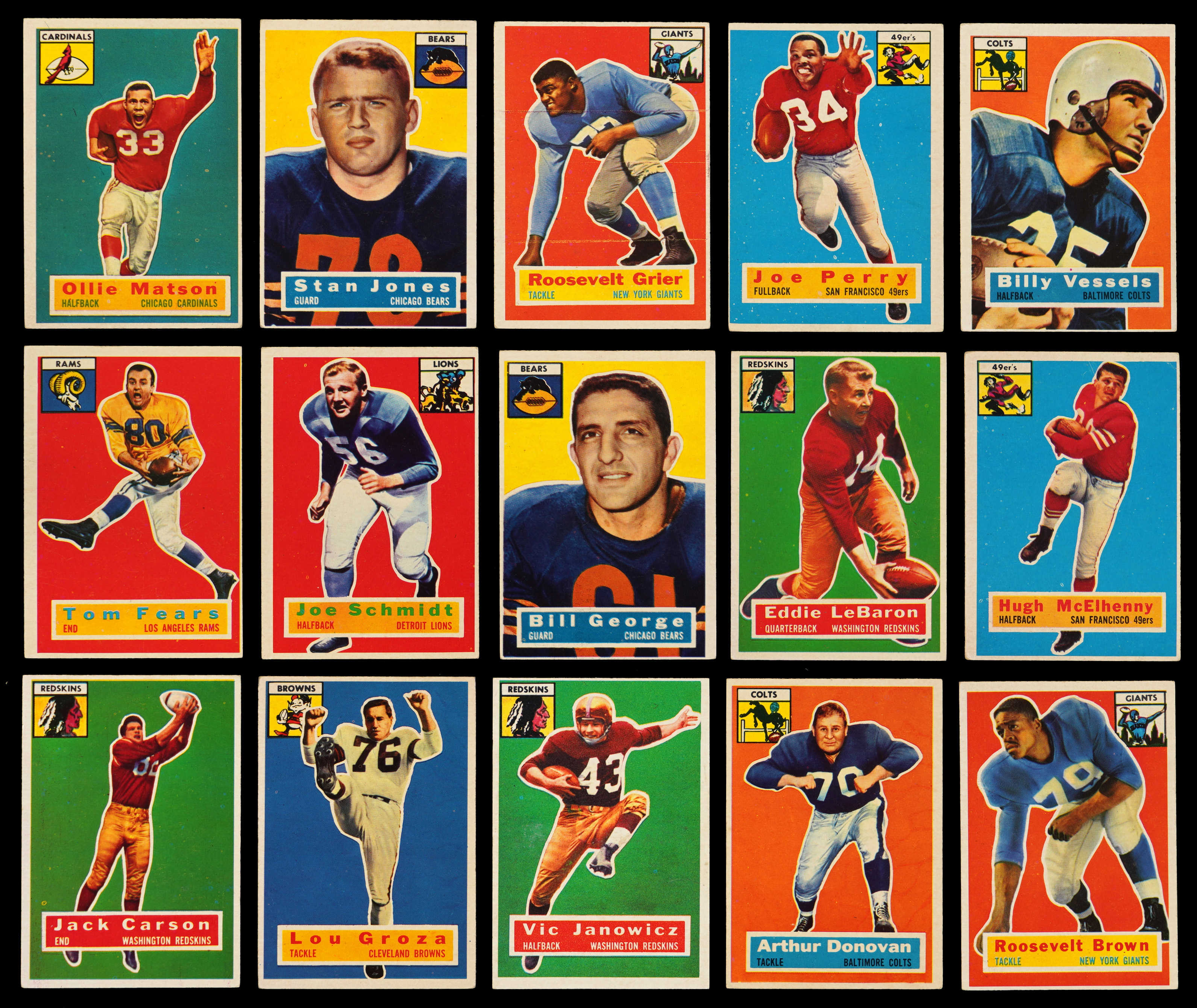 Inaugural “giant size” 1956 Topps Football complete set of (120) cards plus the unnumbered checklist. These gridiron stars have an overall approximate condition breakdown of 30% (EX or better), 25% (VG-EX), 25% (VG) and 20% (GD or lesser). Keys include: #1 Carson SP (VG-EX), #6 Van Brocklin (VG-EX), #9 Groza (GD), #11 Blanda (VG-EX), #13 Janowicz SP (VG-EX), #22 Cardinals Team SP (VG), #28 Bednarik (FR, pen mark), #36 Donovan (VG-EX), #41 R. Brown RC (VG-EX), #42 Fears (VG), #44 Schmidt RC (VG), #47 George RC (VG-EX), #49 LeBaron SP (EX), #50 McElhenny (GD), #53 Gifford (VG), #58 Matson SP (VG-EX), #60 L. Moore RC SP (EX), #61 Redskins Team SP (GD), #71 S. Jones RC (VG), signed #74 Nomellini (card VG, “8”, Auction LOA from James Spence/JSA), #77 Conerly (VG-EX), #78 Hirsch (VG-EX), #86 Tittle (VG-EX), #101 Grier RC (GD), #110 Perry (VG), #116 Layne (VG), #120 Vessels RC (VG) and NNO CL (marked).
