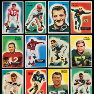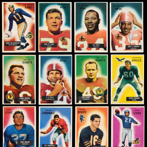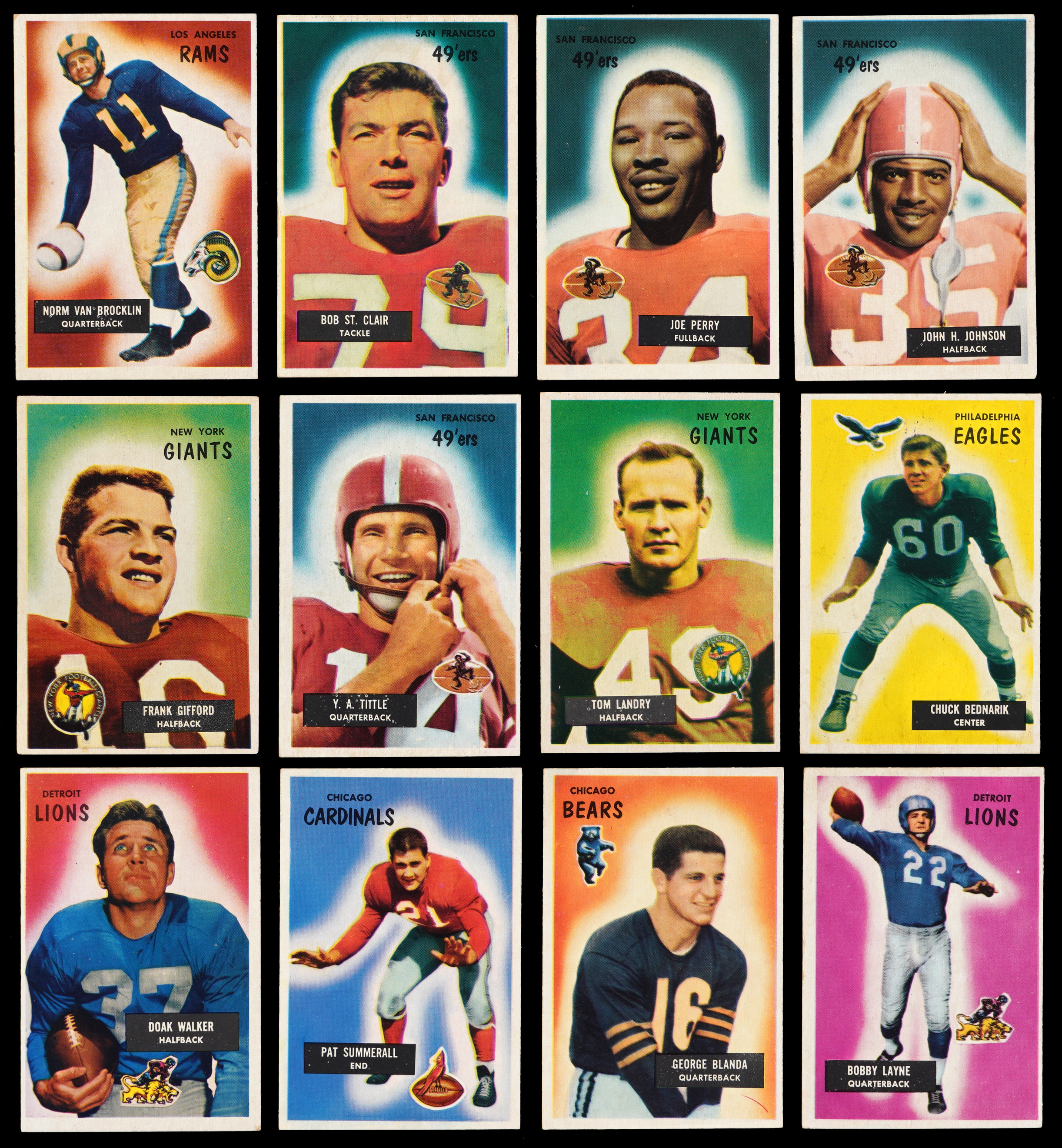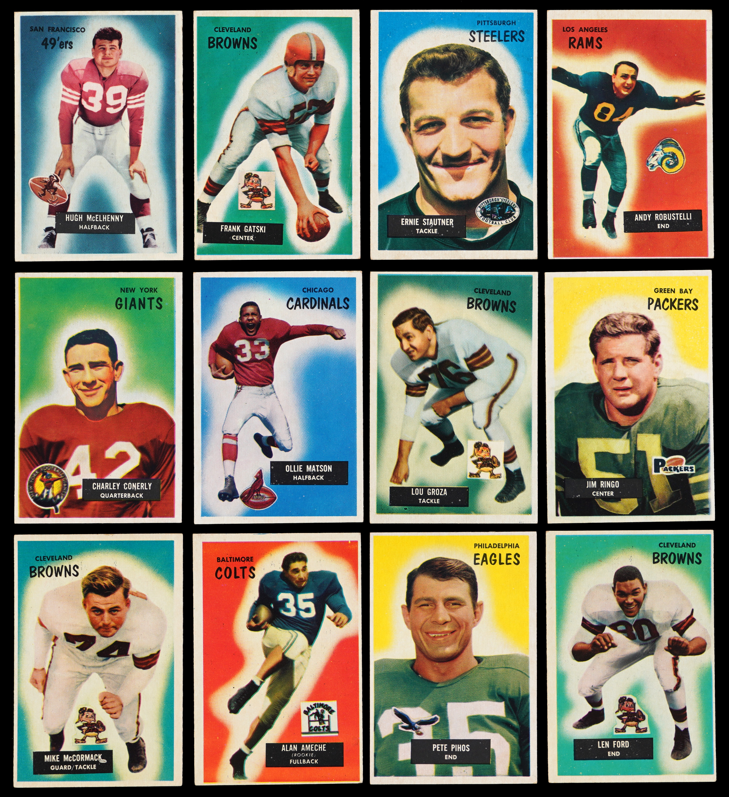 The final entry of gridiron trading card history is available with the offered 1955 Bowman Football complete set of (160) cards. This “collector’s grade” assembly has an overall approximate condition breakdown of 20% (EX or better), 35% (VG-EX), 30% (VG) and 15% (GD or lesser). Keys include: #1 D. Walker (VG-EX), #2 McCormack RC (VG-EX), #7 Gifford (VG-EX), #8 Ameche RC (VG), #10 Pihos (VG-EX), #14 Ford RC (VG), #16 Conerly (EX), #25 Matson (VG-EX), #32 Van Brocklin (VG-EX), #37 Groza (EX), #42 Henry Johnson RC (VG-EX), #44 Perry (VG-EX), #52 Summerall RC (EX-MT), #62 Blanda (VG), #70 Ringo RC (VG), #71 Layne (VG), #72 Tittle (VG-EX), #75 McElhenny (EX), #101 St. Clair RC (VG), #104 Nomellini (trimmed), #119 Gatski RC (VG), #121 Robustelli (VG), #133 Janowicz (VG), #134 Stautner (VG), #152 Landry (EX), #158 Bednarik (VG-EX) and #160 Dupre RC (GD).
