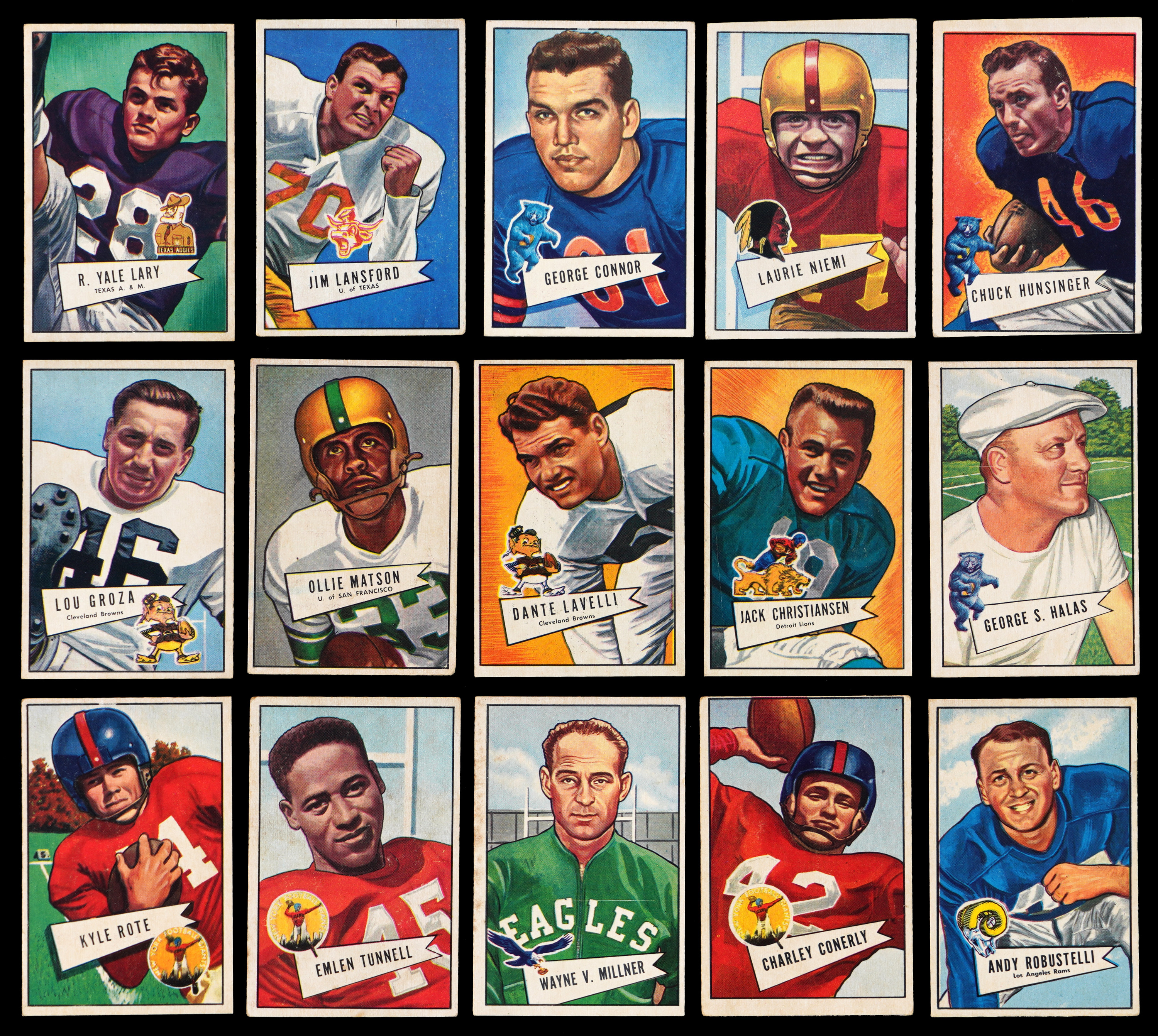 College and professional gridiron stars are celebrated with the offered 1952 Bowman Football Small near set of (119/144) cards. These hard-hitters have an overall approximate condition breakdown of 25% (EX or better), 30% (VG-EX), 25% (VG) and 20% (GD or lesser). Highlights include: #1 Van Brocklin (VG-EX), #2 Graham (VG-EX), #3 Walker (VG), #4 Owen RC CO (GD), #10 Bednarik (VG-EX), #12 Trippi (GD), #13 Fears (EX-MT), #16 Gifford RC (EX), #17 Tittle (VG-EX), #19 Connor (VG), #23 Marchetti RC (EX), #28 Rote RC (trimmed), #29 McElhenny RC (VG-EX), #30 Baugh (VG-EX), #39 Tunnell (GD), #45 Van Buren (FR), #46 Donovan RC (GD), #48 Halas RC CO (VG), #57 Millner RC CO (VG-EX), #63 Conerly (FR), #85 Robustelli RC (GD), #105 Groza (EX-MT), #127 Matson RC (FR), #128 Lavelli (VG-EX), #129 Christiansen RC (VG), #140 Lary RC (EX), #142 Landry (EX) and #144 Lansford RC (VG).