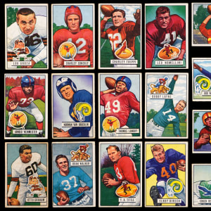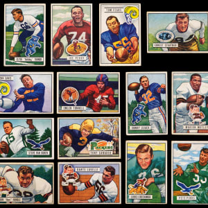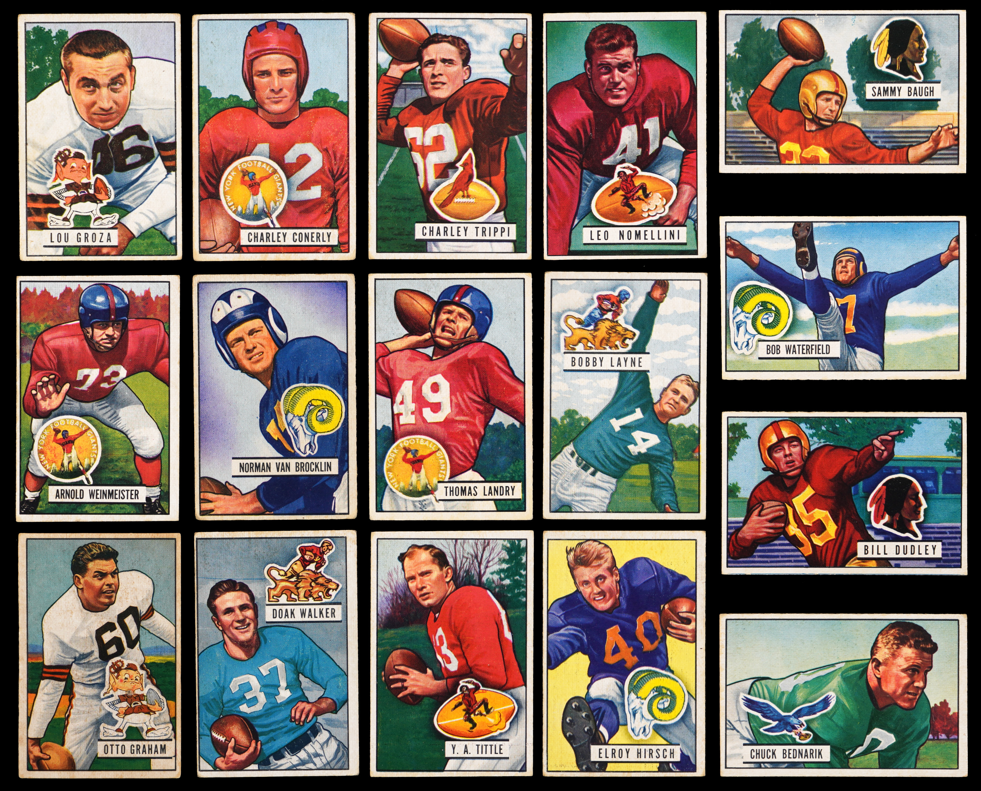 Bid strong for the offered 1951 Bowman Football complete set of (144) cards. This classic gridiron assembly has an overall approximate condition breakdown of 10% (EX or better), 20% (VG-EX), 40% (VG) and 30% (GD or lesser). Highlights include: #1 Humble RC (GD), #2 Graham (VG, stain), #4 Van Brocklin RC (GD), #6 Fears (VG), #10 Van Buren (VG-EX), #12 Bednarik (VG-EX), #13 Turner (FR, writing), #15 Lujack (VG), #20 Landry RC (VG), #21 Weinmeister RC (VG), #25 D. Walker (GD), #32 Tittle (VG), #34 Baugh (EX), #40 Waterfield (EX), #42 G. Davis (GD), #46 Pihos (GD), #56 Conerly (GD), #62 Creekmur RC (VG), #73 Lavelli (VG-EX), #75 Groza (GD), #76 Hirsch (VG), #90 Canadeo (VG-EX), #91 Tunnell RC (VG-EX), #96 Stautner (VG), #102 Layne (VG), #105 Perry (VG, stain), #109 Motley (GD), #137 Trippi (VG), #140 Nomellini (VG) and #144 Dudley (VG-EX).
