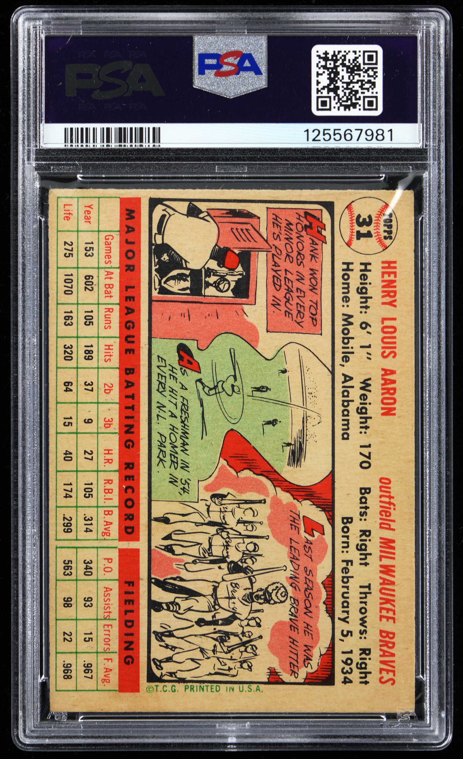 Graded EX-MT 6 by PSA with an (mc) qualifier. Early career card of Milwaukee Braves Hall of Famer Hank Aaron. White back.