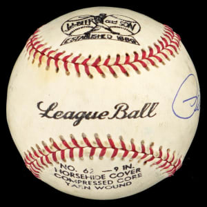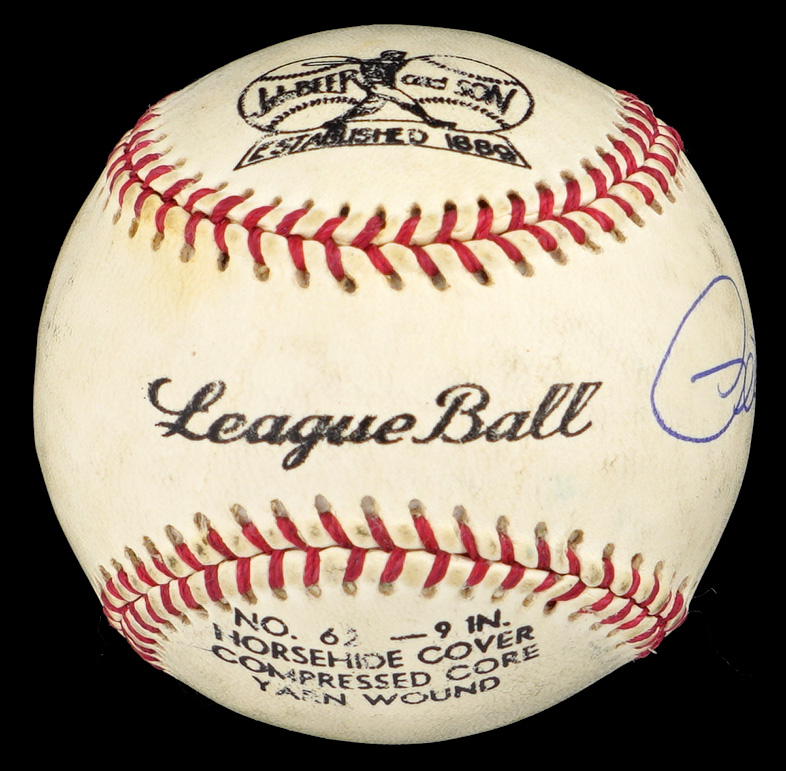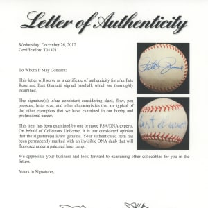The offered baseball is a J. DeBeer and Son League Ball model in attractive condition, with light toning. Giamatti (d.1989) has signed on the sweet spot, and Rose has signed sharply on the south panel. Rose and Giamatti dual-signed baseballs appear to be few in number, and currently offered examples come with a steep asking price. This may be your best shot at getting a fully certified one.