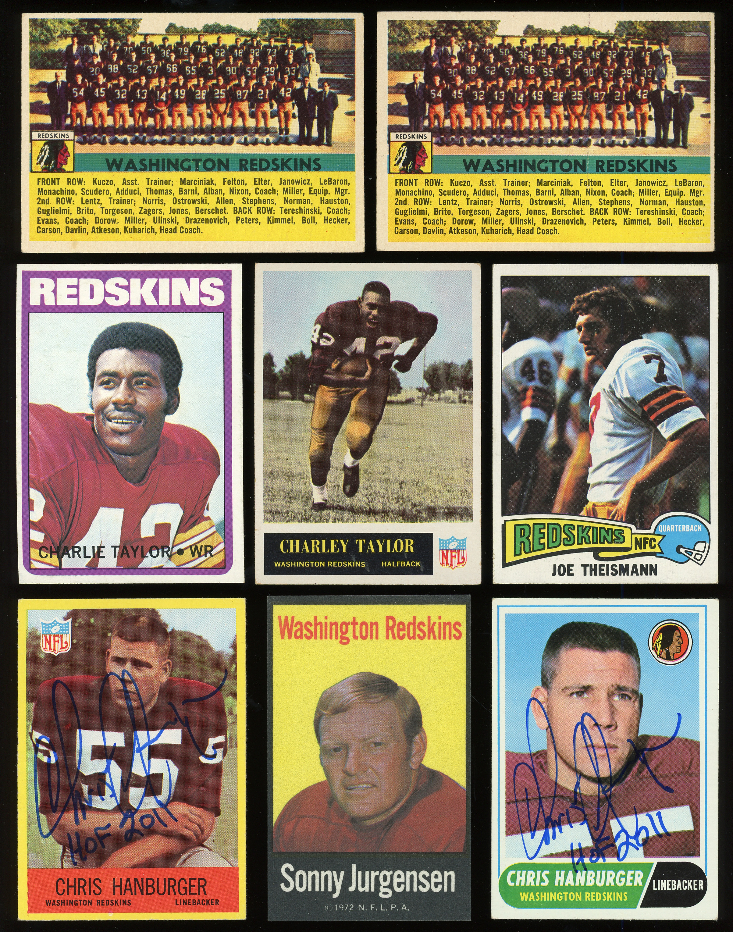 1960s Redskins: (138 cards, average EX) with (11) 1960 Topps: (2) #132 Redskins Team (VG, GD); (1) 1960 Topps Metallic Stickers (VG-EX), (9) 1961 Fleer, (10) 1961 Topps, (13) 1962 Topps: #164 Snead RC SP (EX); (14) 1963 Topps: #170 CL (EX); (15) 1964 Philadelphia: #186 Jurgensen (EX); (15) 1965 Philadelphia: #189 Krause RC (VG), #195 C. Taylor RC (VG); (15) 1966 Philadelphia, (14) 1967 Philadelphia with signed #183 Hanburger (EX-MT, “9”, HOF 2011); (10) 1968 Topps (one signed) with signed #62 Hanburger (EX, “9”, HOF 2011); (11) 1969 Topps;