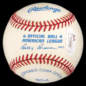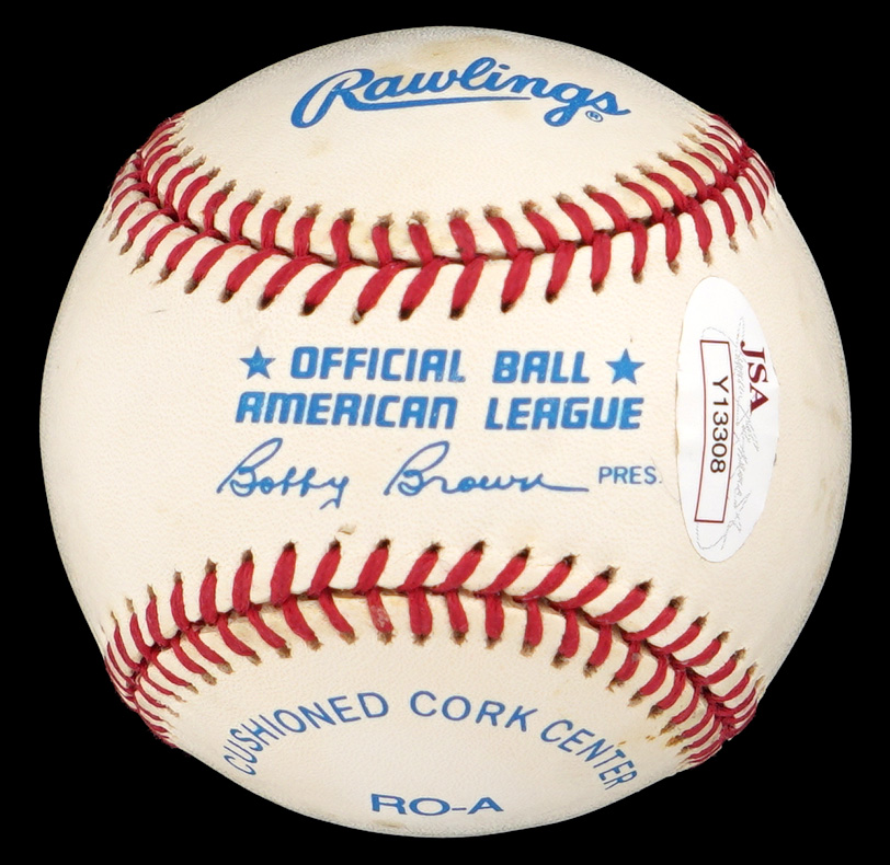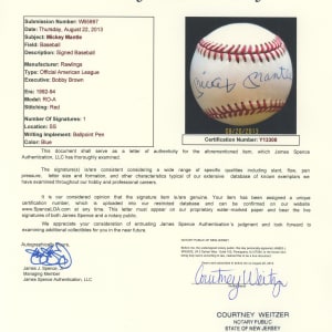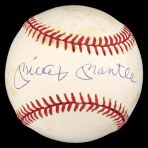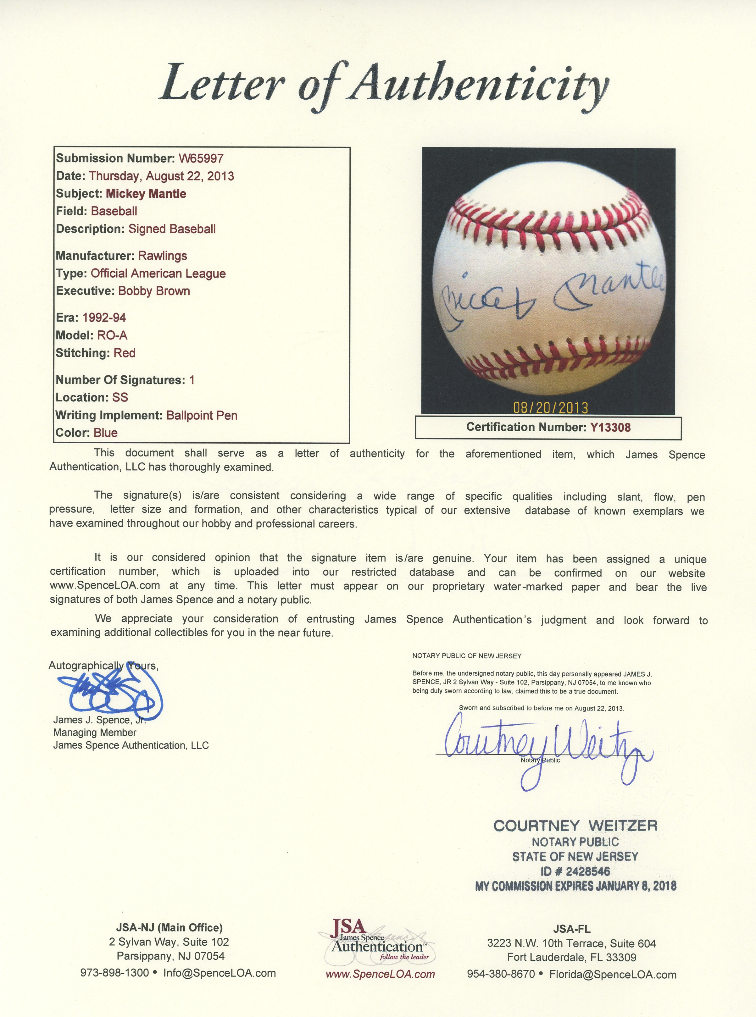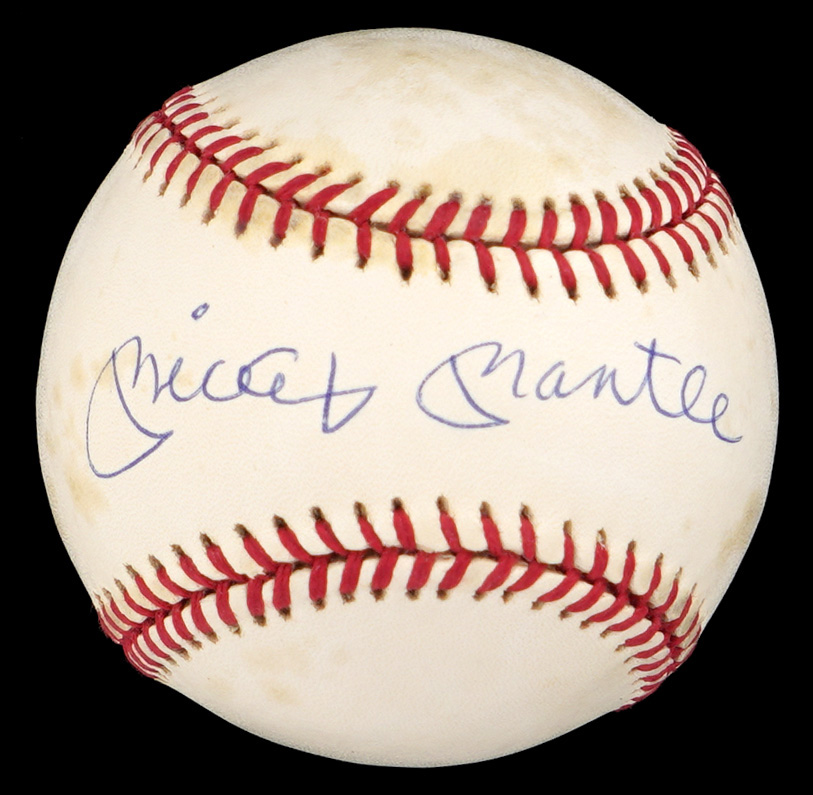 Playing in the nation's most populous city, Mickey Mantle was a media darling, who was as popular as any ballplayer this side of "Babe" Ruth. Thirty years after his demise, Mantle remains a prime target in the sports memorabilia hobby. Bring this much-loved legend into your fold, with the capture of this Mantle single-signed OAL/Brown baseball. Mantle's sweet spot signature is a solid, pleasing application, and the ball is attractive with light, sporadic toning.