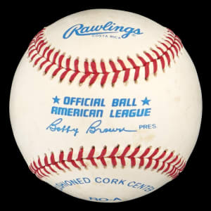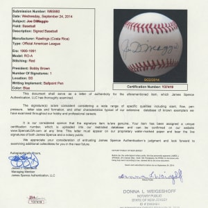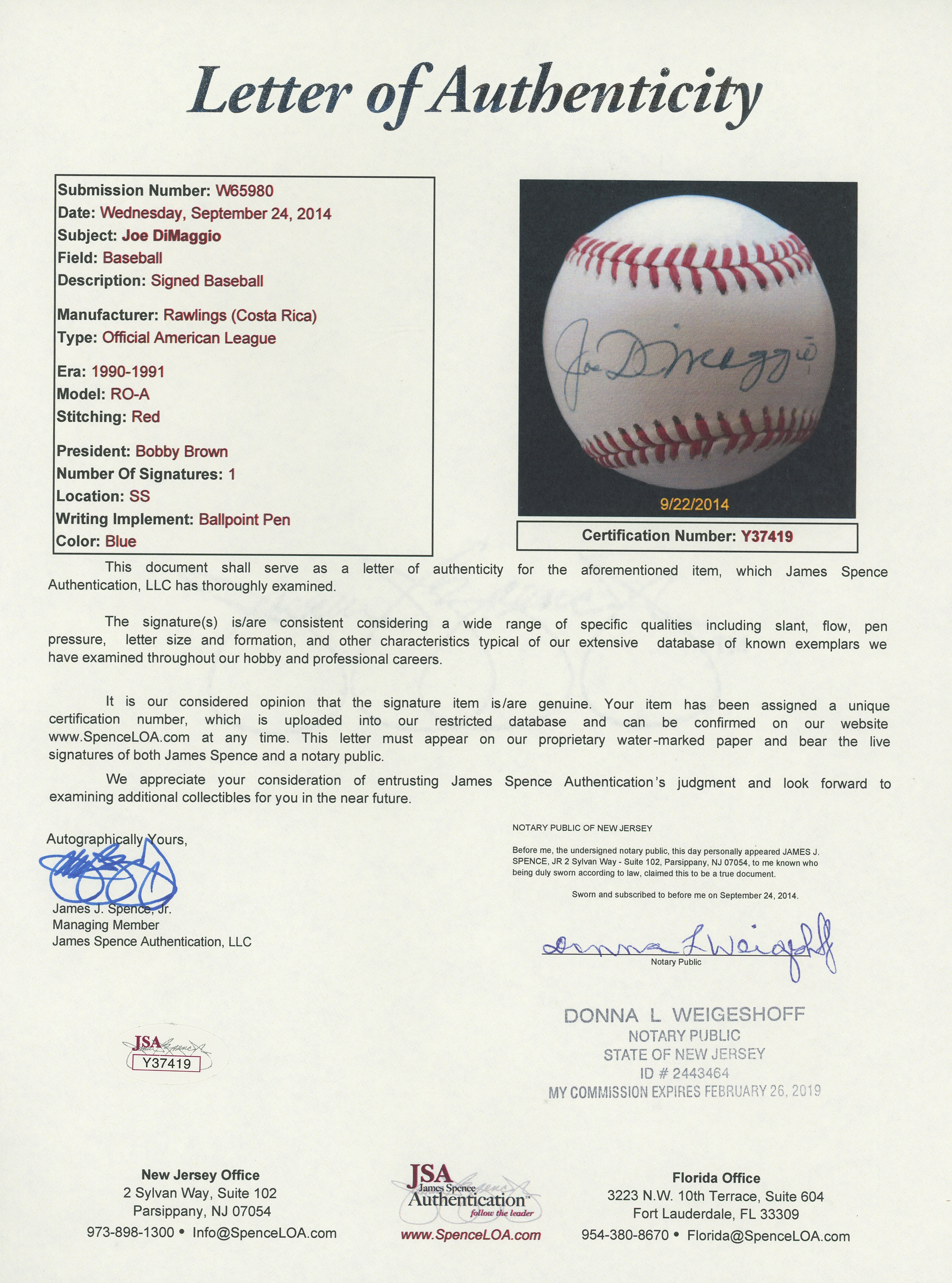 Catch hold of a blast from the great Joe DiMaggio, with this single-signed OAL/Brown baseball. Thanks to his on-field grace and timely hitting, DiMaggio was the object of tremendous fan affection, and his legend lives on as a key hobby figure. DiMaggio came through in fine style with pen in hand, when he applied this satisfying signature to the sweet spot of this bright, clean ball.