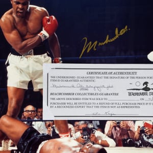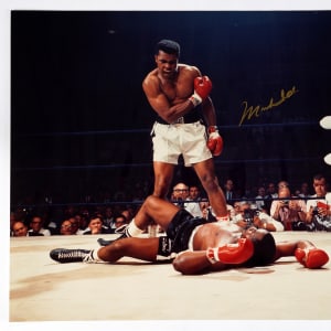 One of the most famous moments in boxing history is recalled, with this Muhammad Ali signed 16" x 20" photograph. Taken by Sports Illustrated photogrpaher Neil Leifer, this oversized photograph depicts Muhammad Ali's controversial knockout of Sonny Liston in the first round of their second heavyweight championship fight, which took place on May 25, 1965, at the Central Maine Youth Center in Lewiston, Maine. Widely considered the greatest sports shot of all-time, this dynamic scene sees a snarling Ali standing over the downed Liston. It has been reported that Ali was yelling "Get up and fight, sucker!" and "Nobody will believe this!". Liston's sprawl on the canvas came courtesy of a quick right from Ali, known as the "Phantom Punch". This iconic photograph presents handsomely, with sharp images and excellent gloss. Ali has signed boldly in gold, in strong contrast against the darkened background.