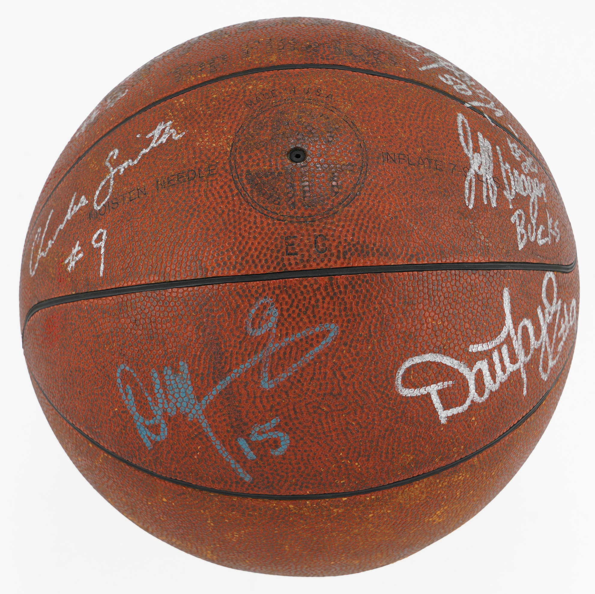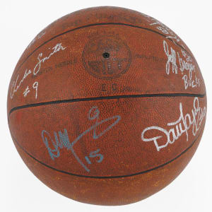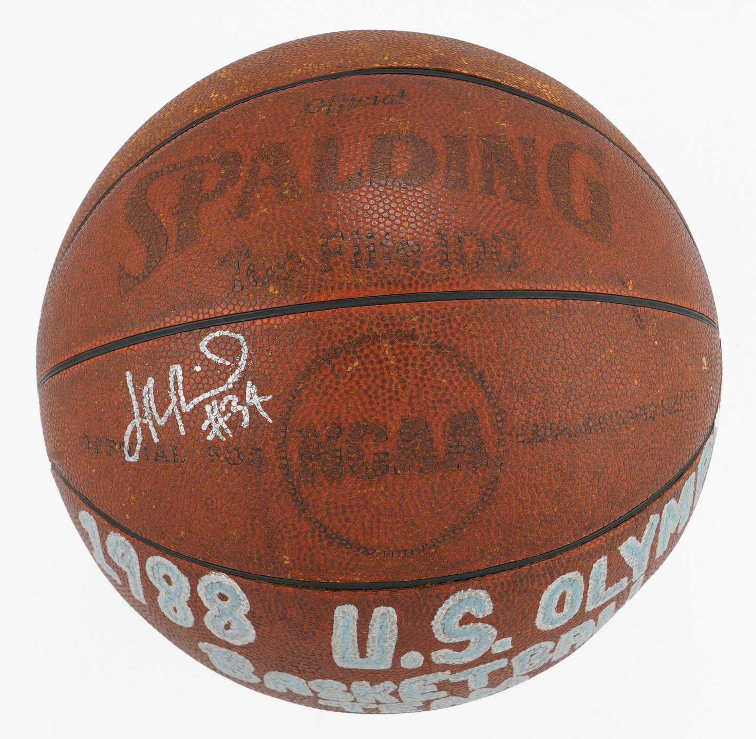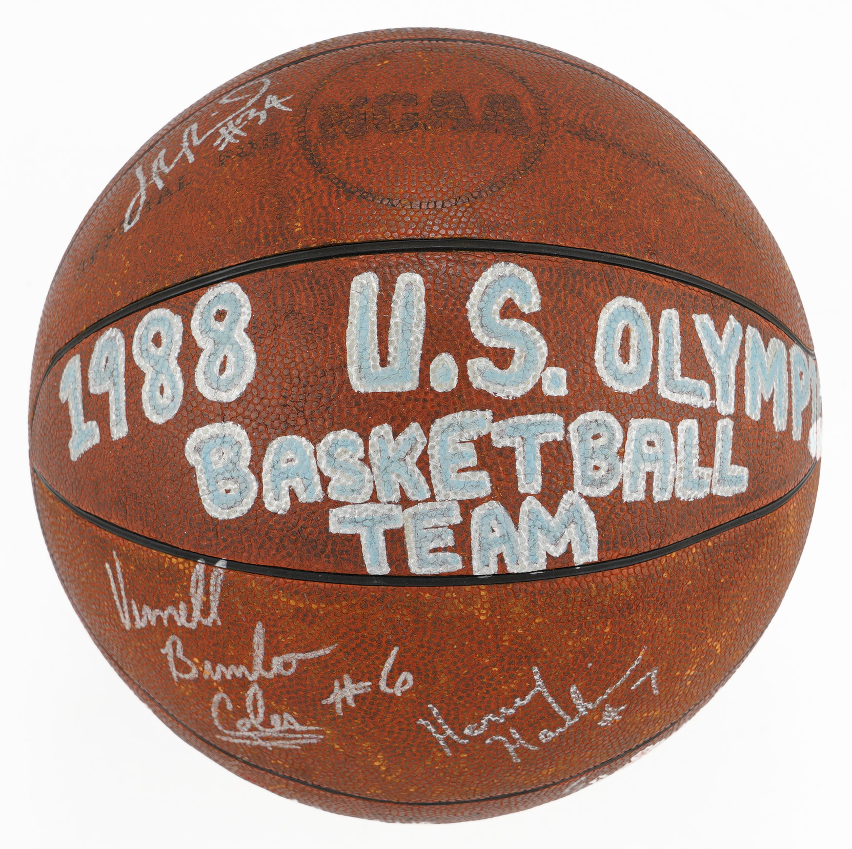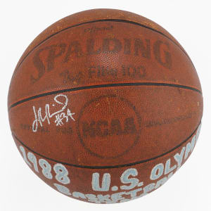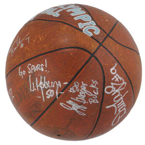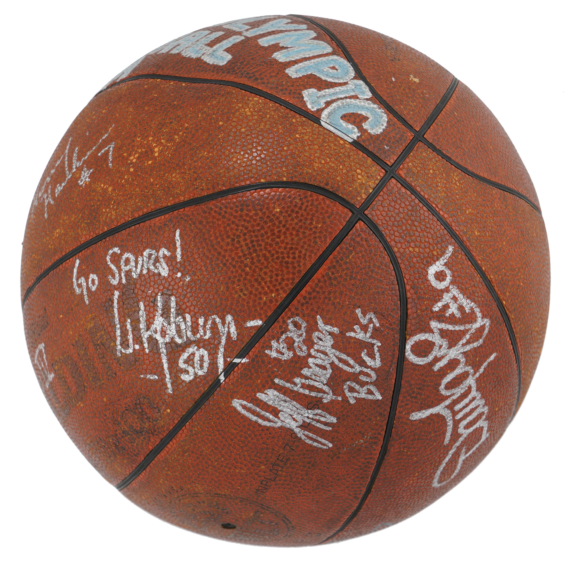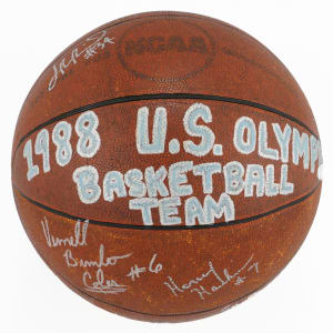 A used NBA ball with faded markings has been transformed into a trophy ball with the addition of “1988 US Olympic Basketball Team” to one of the panels. This was the last Olympics where the US was not allowed to use its NBA players. The team decorated the ball with (9) strong signatures averaging (“7 to 9”), most with their uniform numbers inscribed. Future NBA Hall of Famer David Robinson has added a “Go Spurs!” inscription to his signature anticipating his first year in the league.