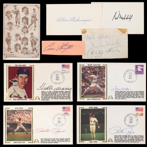 1978-82 First Day Cover Envelopes (9): Ted Williams, Steve Carlton (2), Pete Rose (2), Gaylord Perry, Rick Langford, Len Barker, Lou Brock.