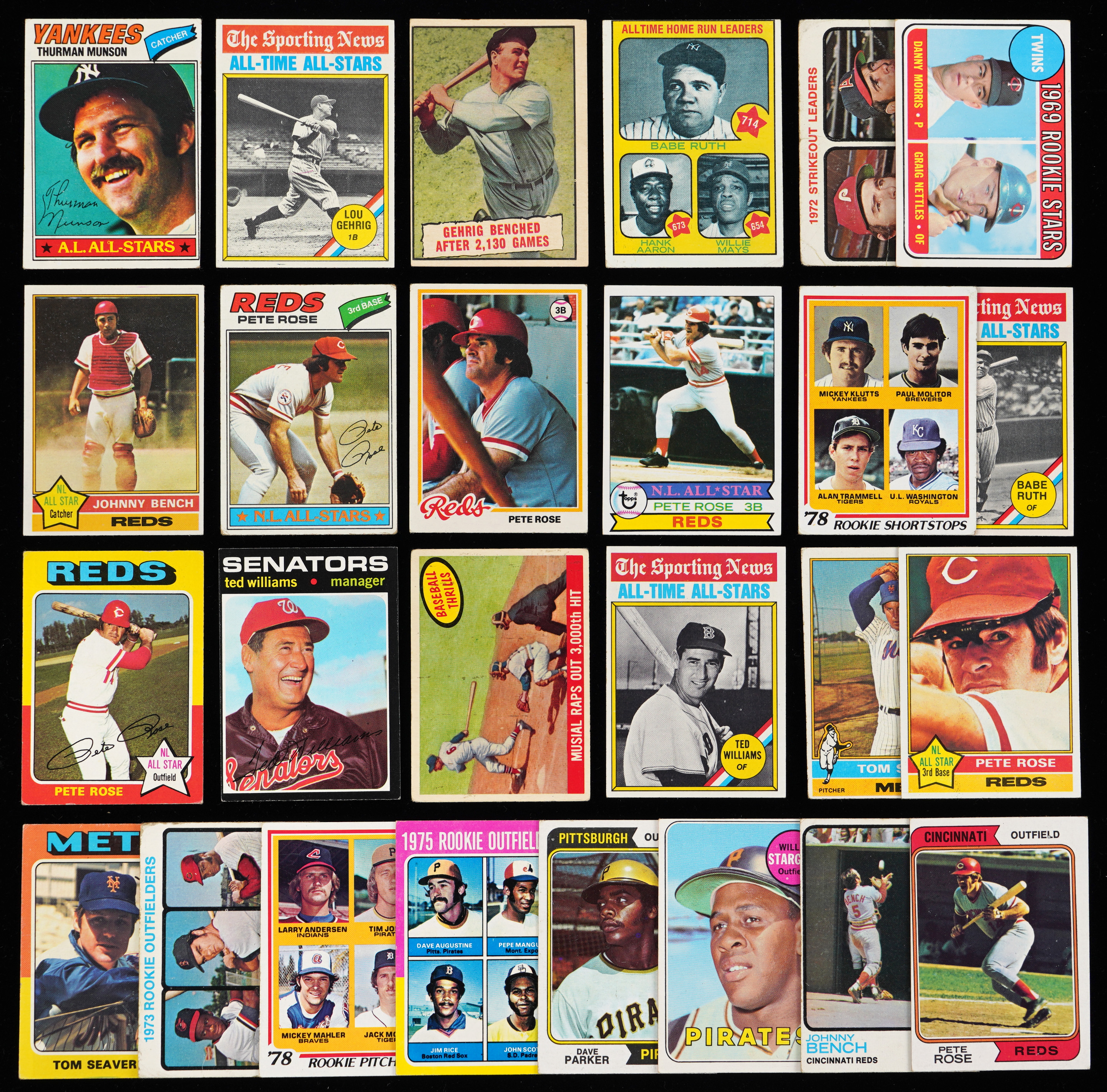 1976 Topps: (21 stars, average VG to VG-EX) with (2) #240 Rose (EX, VG-EX), #300 Bench (VG-EX), #341 Gehrig ATG (EX-MT), #345 Ruth ATG (EX-MT), #346 Cobb ATG (EX), #347 T. Williams ATG (EX), #550 Aaron (EX), #600 Seaver (GD);
