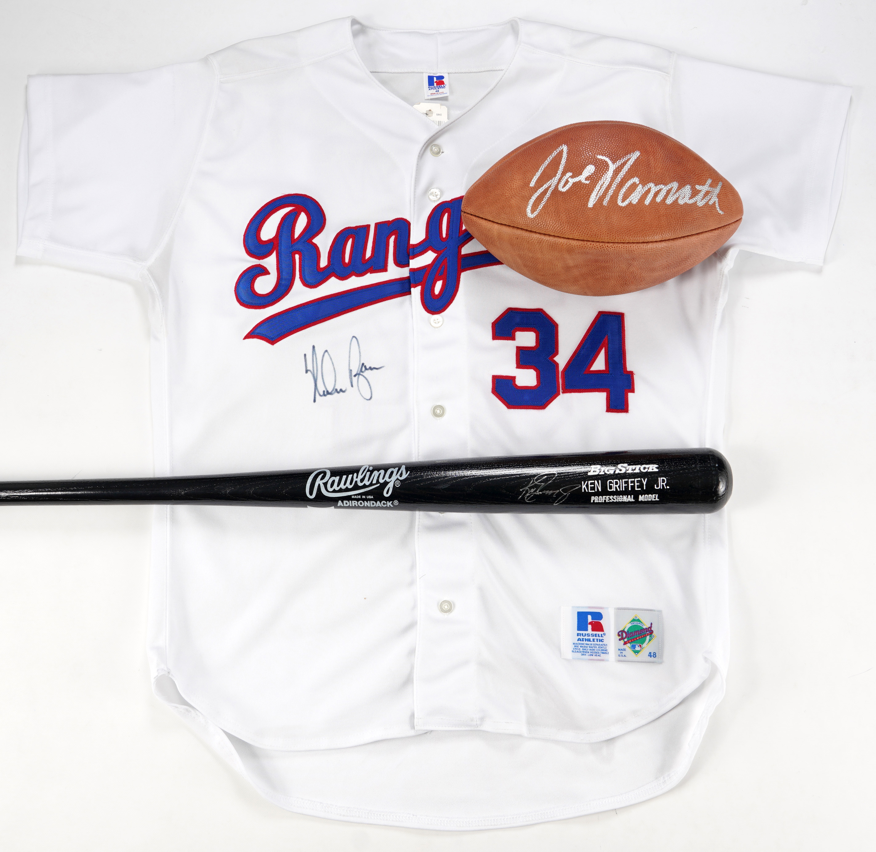 Nolan Ryan Signed Texas Rangers Jersey. Size 48 Russell Athletic Diamond Collection signed on front with large, bold (“8-9”) signature.