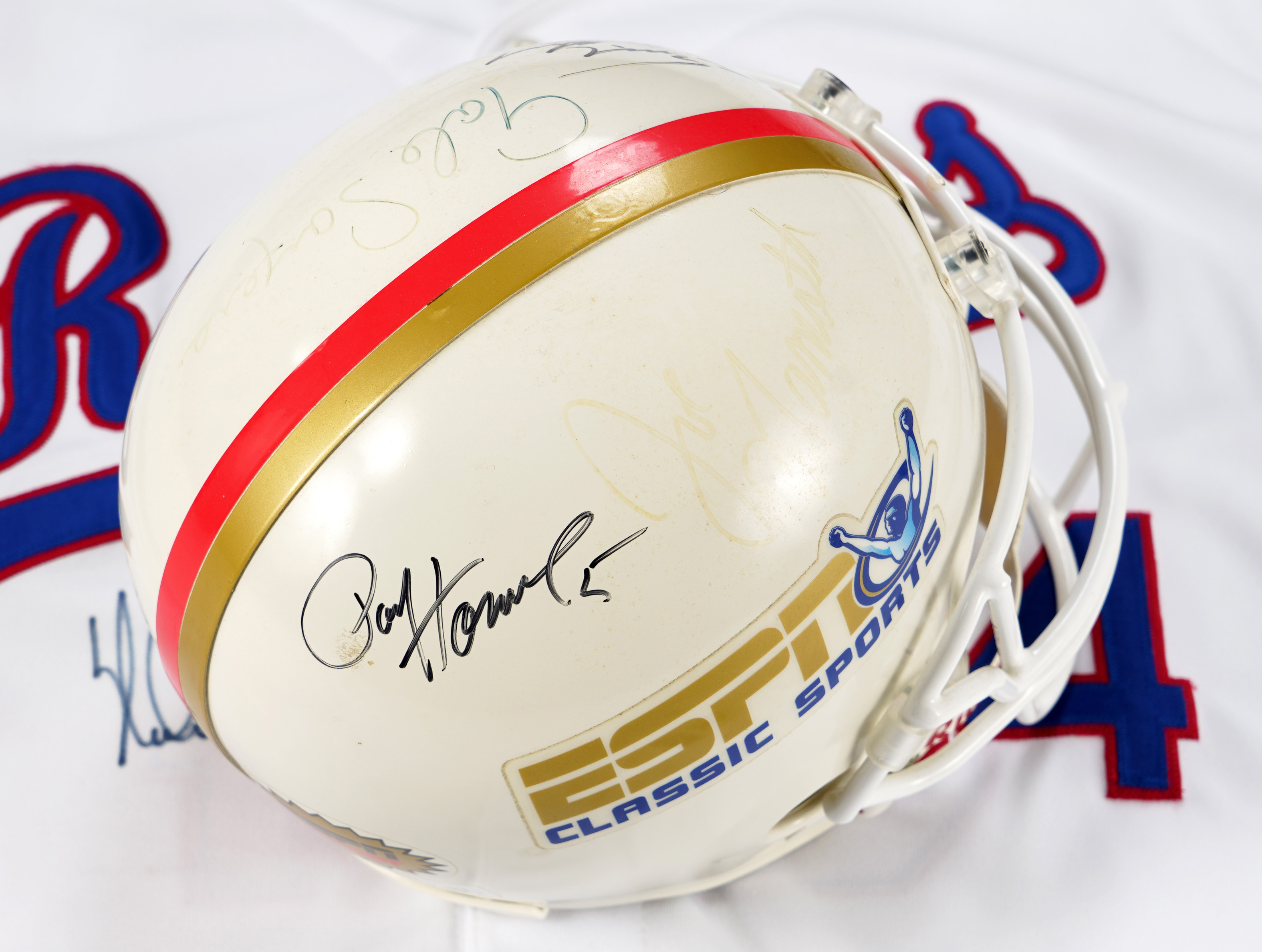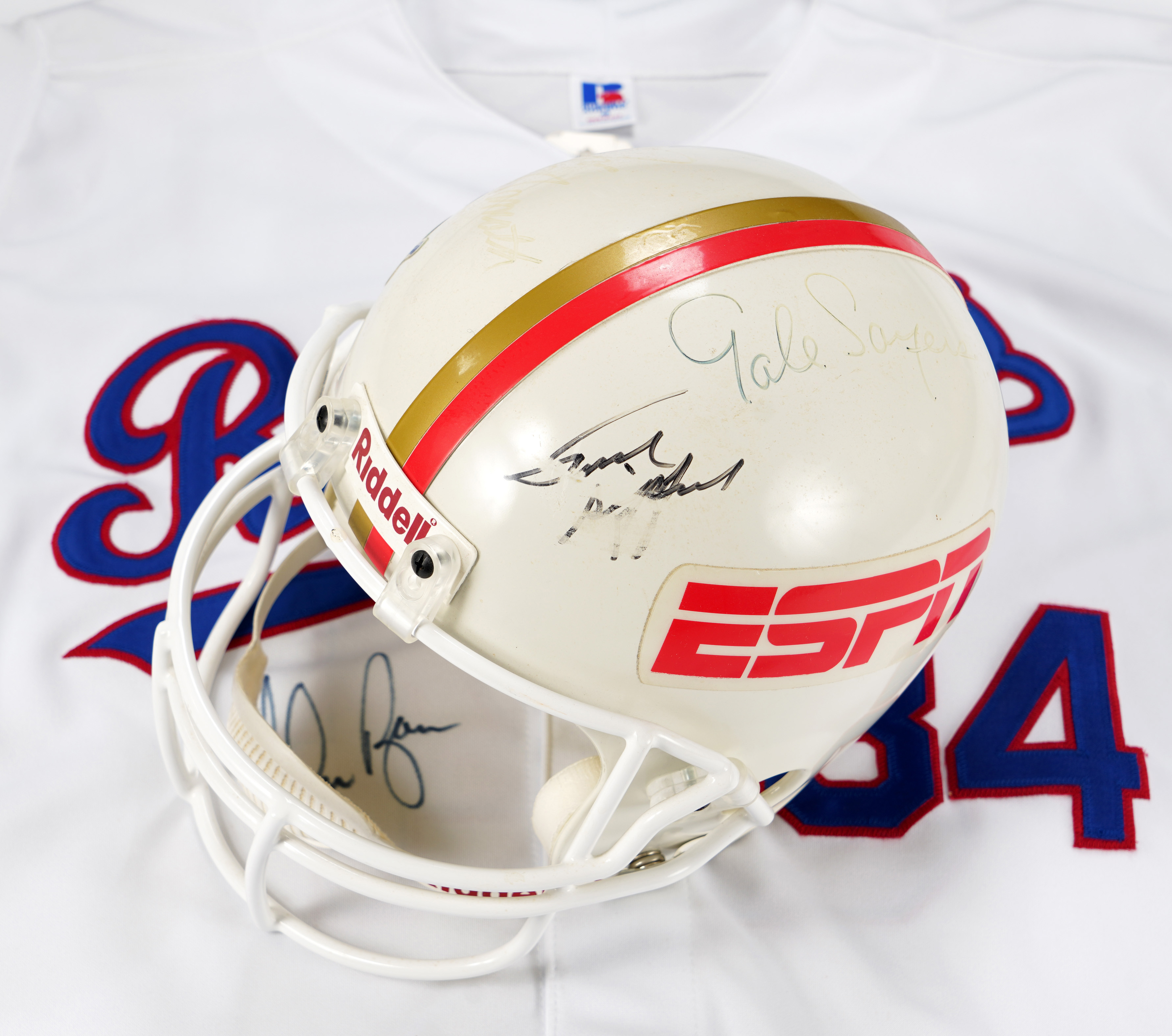 Joe Namath, Paul Hornung, Gale Sayers, Frank Gifford Signed Riddell “ESPN” Helmet. Near Mint size large helmet with (4) signatures of varying potency. Large Joe Namath signature is almost faded. (“1-2”). Paul Hornung signature is (“7-8”) with his number “5” inscribed. Frank Gifford signature has long smudge through it, and possible inscription can't be made out (“2-3”). Gale Sayers signature starts out strong and fades out (“4”).